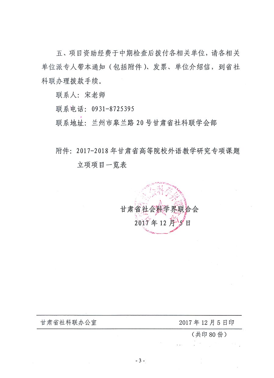 轉(zhuǎn)發(fā)甘肅省社科聯(lián)“關(guān)于2017-2018年甘肅省高等院校外語(yǔ)教學(xué)研究專(zhuān)項(xiàng)課題立項(xiàng)的通知”