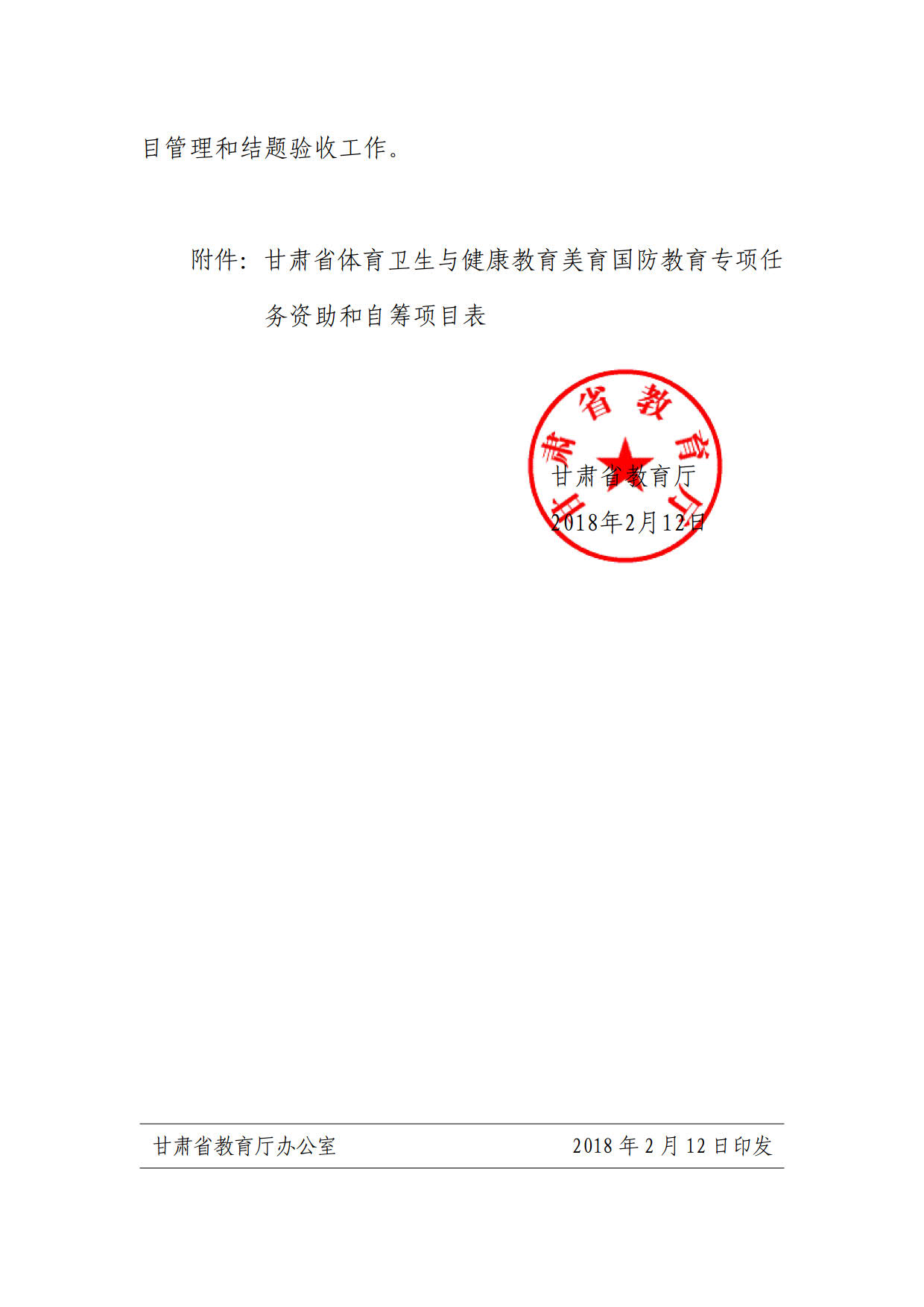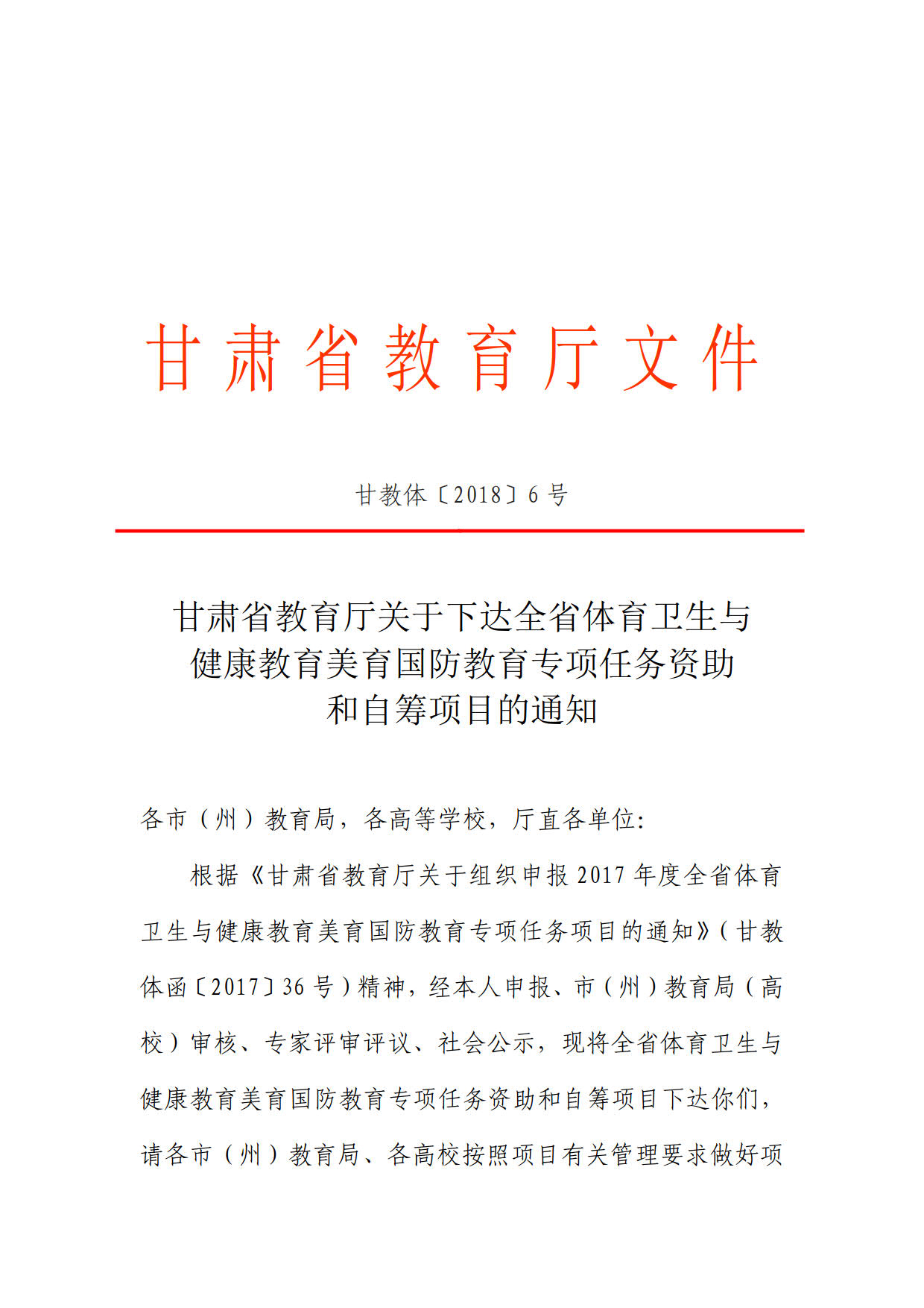 轉(zhuǎn)發(fā)甘肅省教育廳關(guān)于下達(dá)全省體育衛(wèi)生與健康教育美育國防教育專項任務(wù)資助和自籌項目的通知