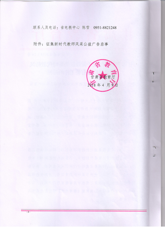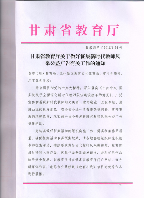 ???? 現(xiàn)將甘肅省教育廳《甘肅省教育廳關(guān)于做好征集新時代教師風(fēng)采公益廣告有關(guān)工作的通知》(甘教師函〔2018〕24號)轉(zhuǎn)發(fā)你們,請各部門、單位根據(jù)通知要求認(rèn)真組織,積極參與。將參賽作品于5月15日前報宣傳統(tǒng)戰(zhàn)部辦公室,宣傳統(tǒng)戰(zhàn)部對報送作品匯總后統(tǒng)一報送省教育廳電教中心。