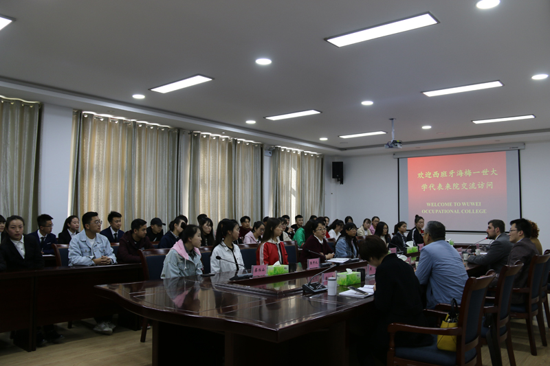 座談會上,田迎春代表全院師生對海梅一世大學(xué)到訪學(xué)院表示歡迎,對省國際交流與合作服務(wù)中心對學(xué)院的關(guān)心表示感謝,并向來訪客人簡要介紹了武威文化歷史、學(xué)院建設(shè)發(fā)展情況、學(xué)院國際交流與合作開展情況。來訪客人對學(xué)院近年來的巨大發(fā)展表示贊賞,對學(xué)院國際交流與合作開展工作表示肯定。Ana女士通過PPT展示介紹了海梅一世大學(xué),希望雙方進(jìn)一步進(jìn)行合作。賓主雙方還就校際交流、語言培訓(xùn)、赴西班牙專升碩留學(xué)項(xiàng)目等共同關(guān)心的問題進(jìn)行了深入交流。
