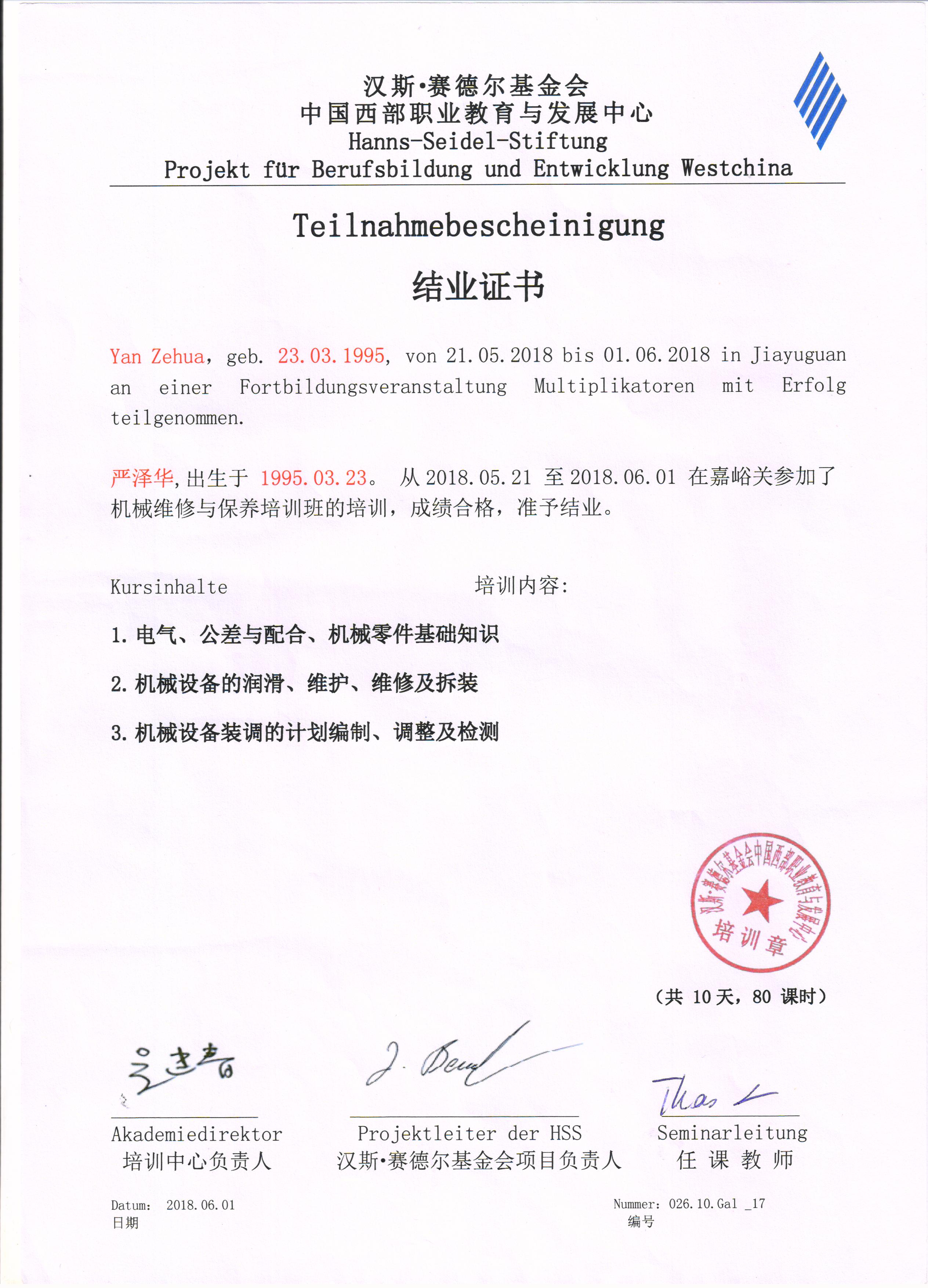 培訓(xùn)證書(shū)--參加漢斯·賽德?tīng)柣饡?huì)中國(guó)西部職業(yè)教育與發(fā)展中心培訓(xùn)