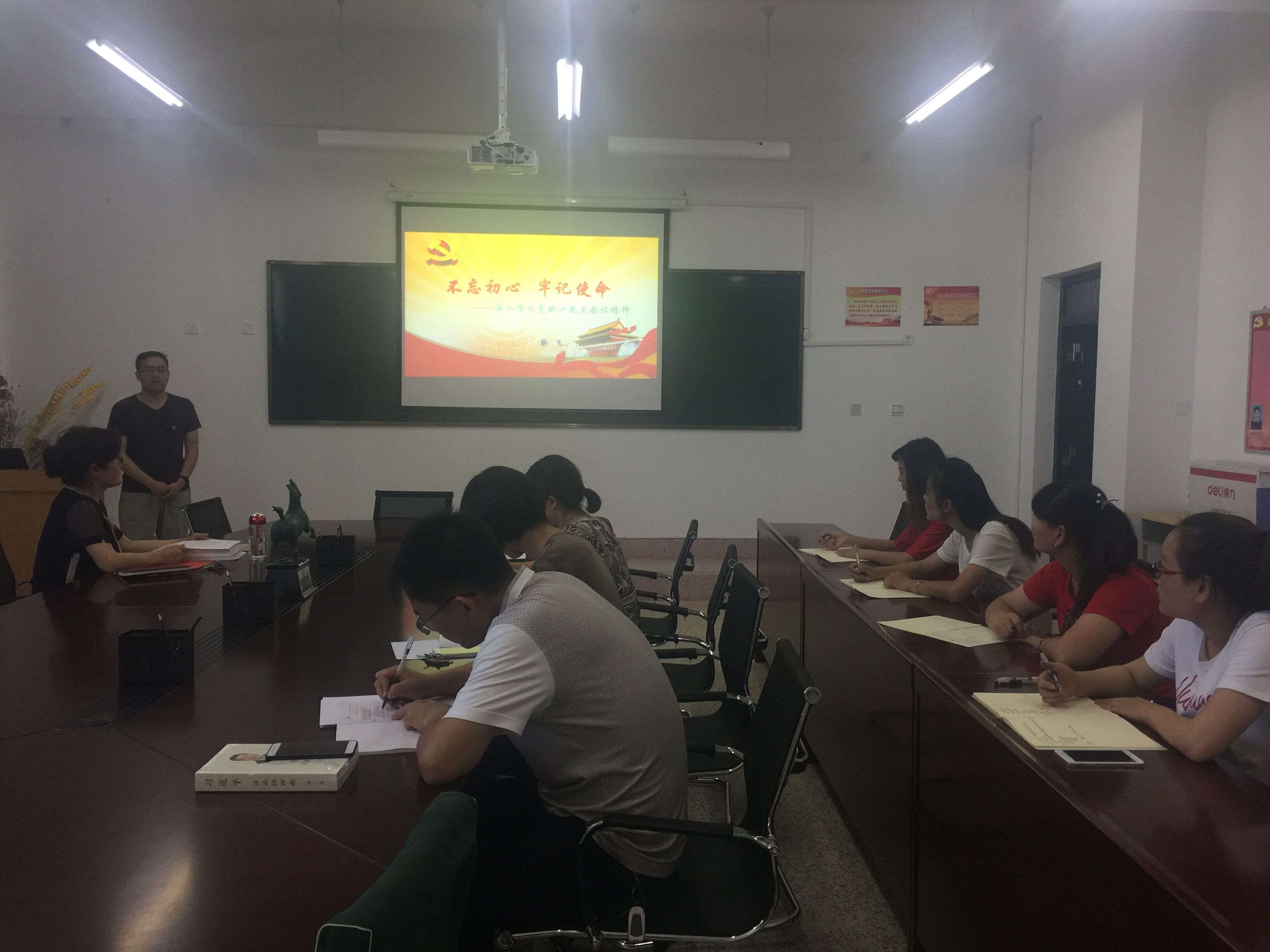 食品專業(yè)黨支部書記蔡飛同志講了題為 “不忘初心 牢記使命——深入學(xué)習(xí)黨的十九大會議精神”的黨課。他主要通過十九大會議的基本情況、重要意義和主題;十九大報告的主要內(nèi)容;十九大報告的重要論斷和亮點(diǎn),帶領(lǐng)全系黨員再一次深入學(xué)習(xí)了十九大精神。