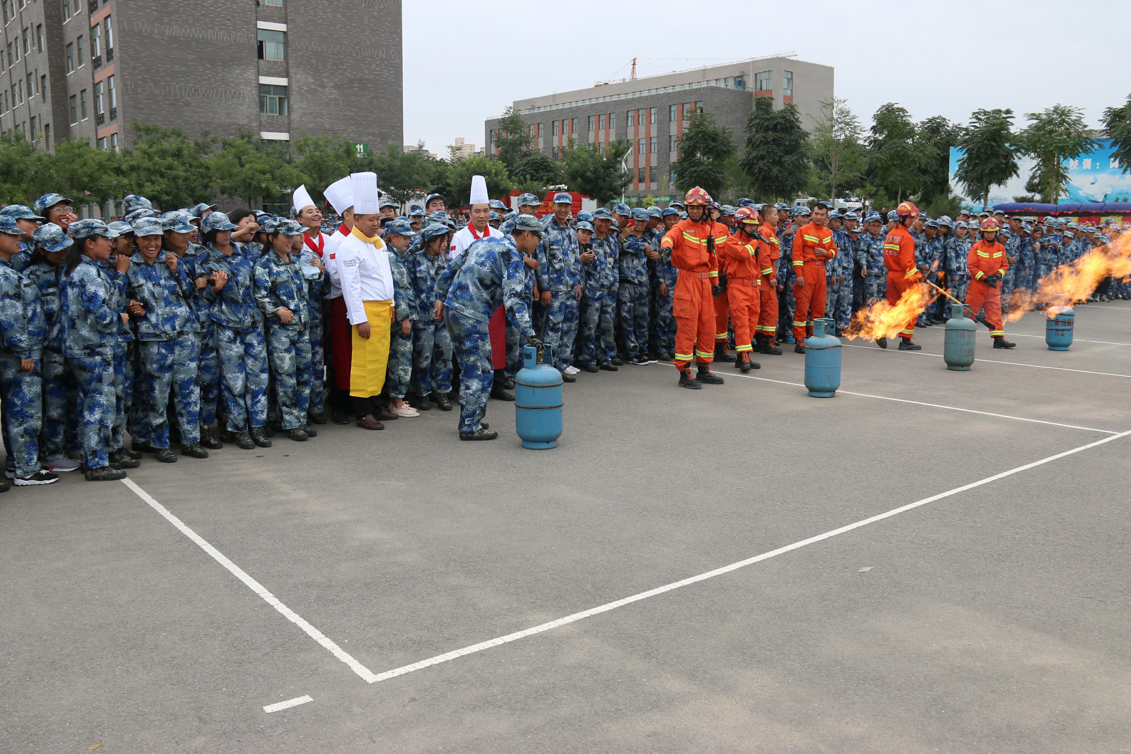 隨后,所有參演學(xué)生整隊(duì)到操場參加了滅火演練。在消防官兵的講解和和示范下,同學(xué)們體驗(yàn)了處置著火液化氣瓶、干粉滅火器滅火、穿消防救生衣、通過模擬煙室等操作。