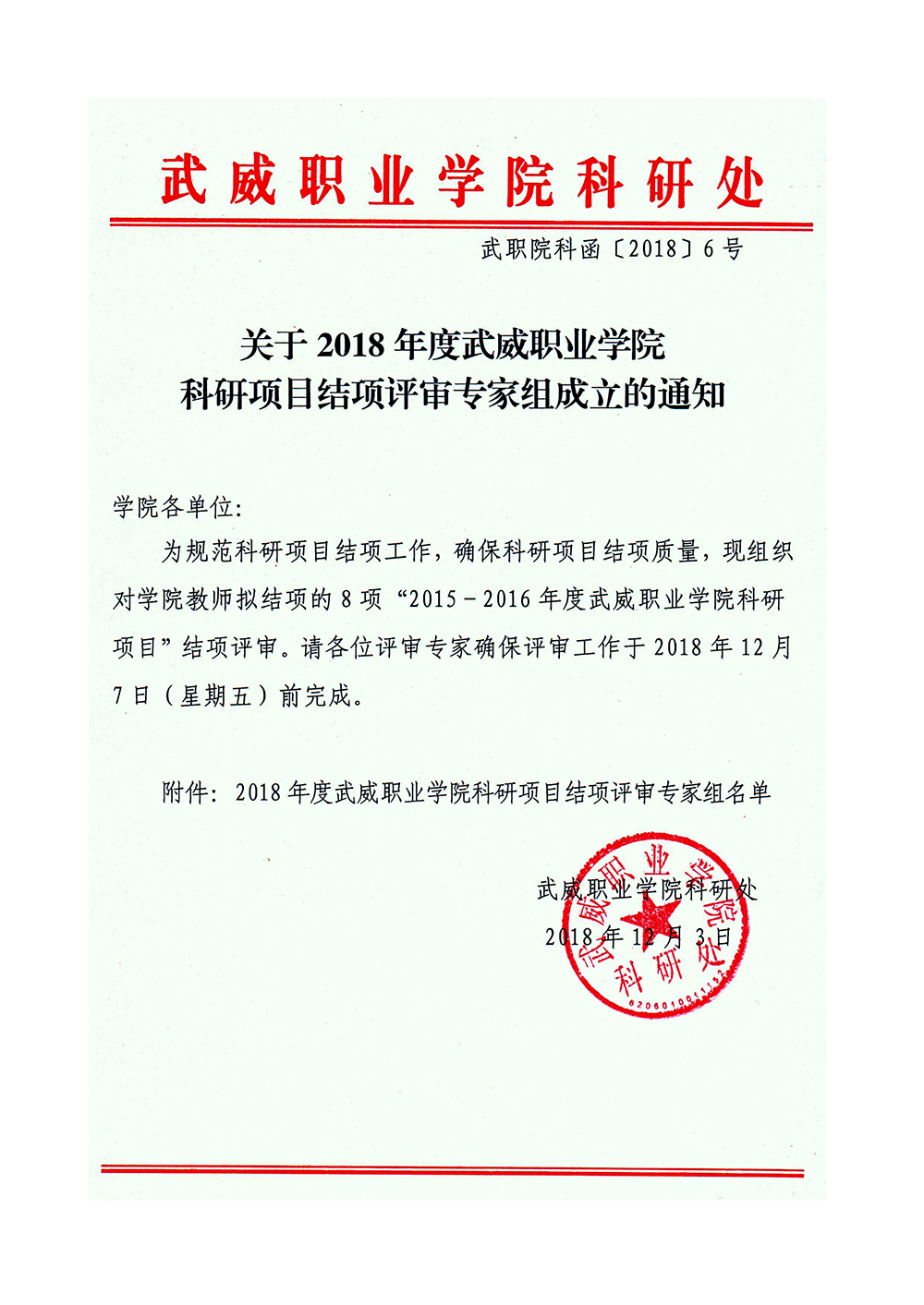 關(guān)于2018年度武威職業(yè)學(xué)院科研項目結(jié)項評審專家組成立的通知