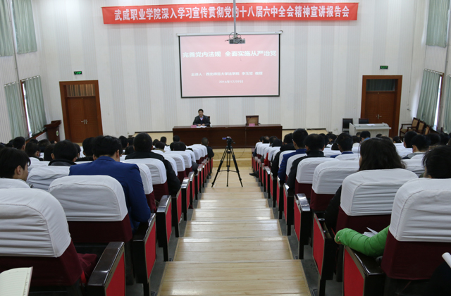 為全面準(zhǔn)確學(xué)習(xí)宣傳黨的十八屆六中全會精神,12月9日上午,學(xué)院在尚德樓正德廳舉辦“深入學(xué)習(xí)宣傳貫徹黨的十八屆六中全會精神宣講報告會”,邀請西北師范大學(xué)教授李玉璧作題為《完善黨內(nèi)法規(guī) 全面實(shí)施從嚴(yán)治黨》的宣講報告。學(xué)院副院長王永緒、潘玉華、田迎春,中層干部及師生代表200余人參加報告會。田迎春主持宣講報告會。