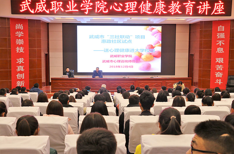 12月4日晚上,學(xué)生工作處聯(lián)合武威市“三社聯(lián)動(dòng)”惠政社區(qū)試點(diǎn)項(xiàng)目在學(xué)院菁英廳舉辦了心理健康專(zhuān)題講座暨心理信息員培訓(xùn)。此次講座邀請(qǐng)武威市心理咨詢(xún)師協(xié)會(huì)會(huì)長(zhǎng)何飛老師主講,學(xué)院各系輔導(dǎo)員、2017級(jí)、2018級(jí)班級(jí)心理信息員、心翼心理社團(tuán)會(huì)員等220多人聆聽(tīng)了講座。學(xué)生工作處處長(zhǎng)王守云主持活動(dòng)。