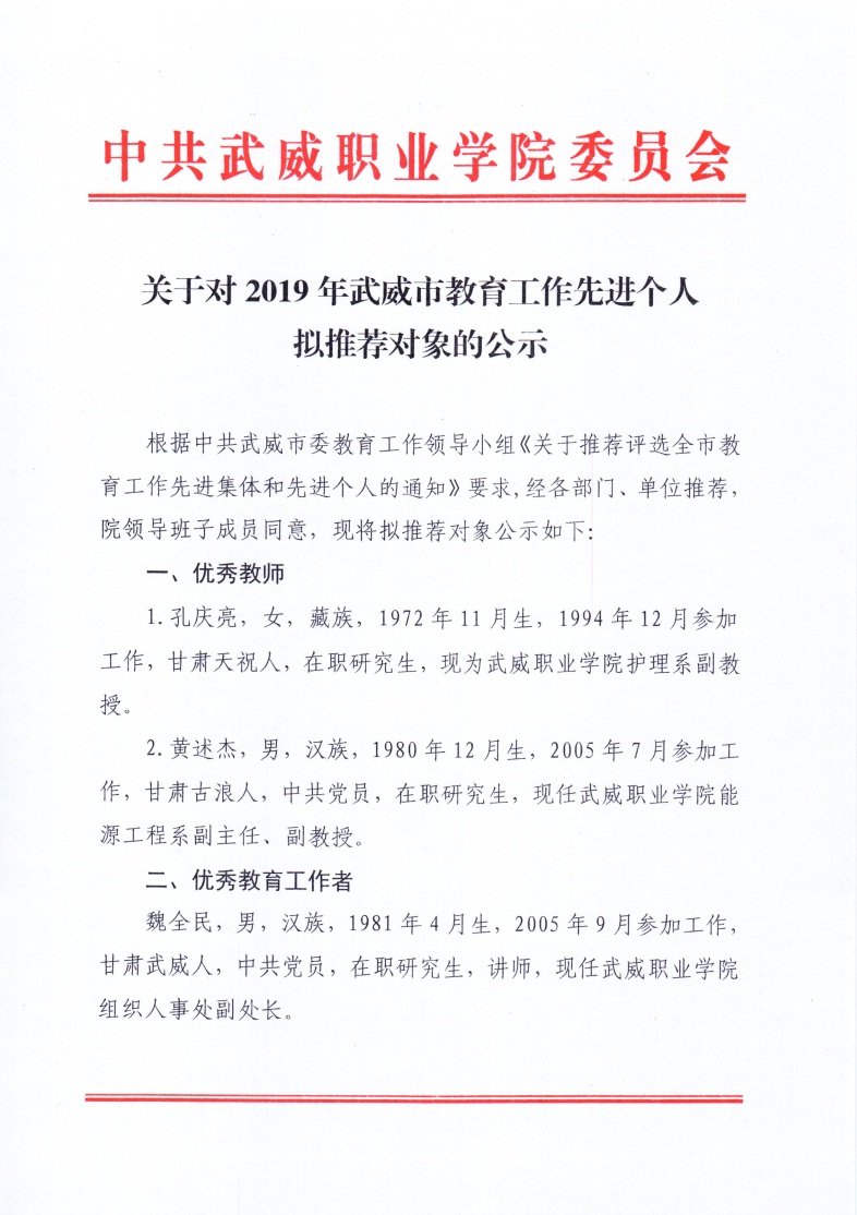 關(guān)于對(duì)2019年武威市教育工作先進(jìn)個(gè)人擬推薦對(duì)象的公示