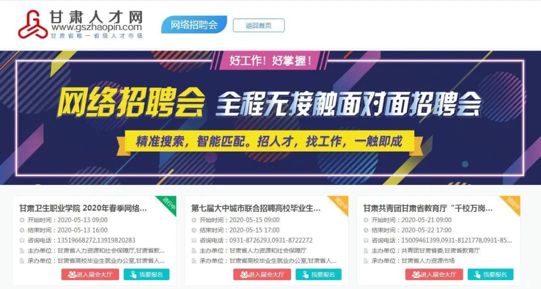 為應(yīng)對新冠肺炎疫情沖擊,加大高校畢業(yè)生就業(yè)服務(wù)力度,進一步做好高校畢業(yè)生就業(yè)服務(wù)工作,甘肅省高校畢業(yè)生就業(yè)辦公室、甘肅省人力資源市場定于2020年5月15日聯(lián)合甘肅省內(nèi)部分高校在甘肅人才網(wǎng)(www.gszhaopin.com)舉辦“第七屆大中城市聯(lián)合招聘高校畢業(yè)生春季網(wǎng)絡(luò)視頻專場招聘會‘甘肅站’”活動。