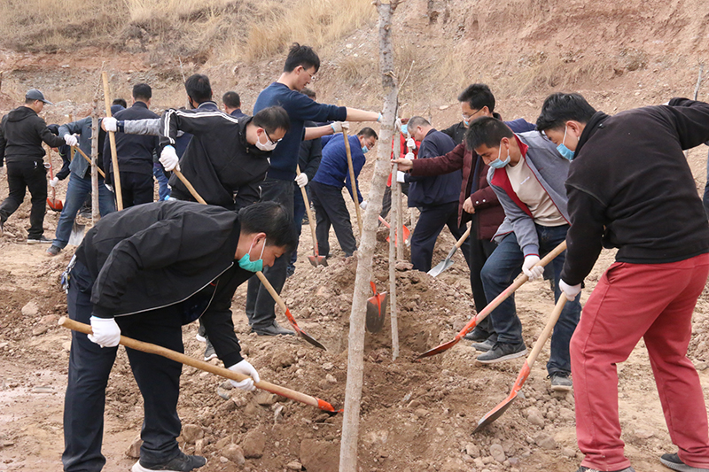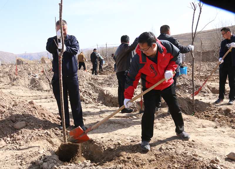 春風吹拂處,新綠綻枝頭。為深入學習貫徹習近平總書記視察甘肅的重要講話和批示精神,認真踐行綠水青山就是金山銀山的發(fā)展理念,實施綠色發(fā)展戰(zhàn)略,進一步加強祁連山生態(tài)環(huán)境保護與治理,幫助幫扶鎮(zhèn)打贏脫貧攻堅戰(zhàn),實施鄉(xiāng)村振興戰(zhàn)略,4月9日,學院領導班子成員、幫扶干部、駐村干部及部分教職工70多人深入結(jié)對幫扶鎮(zhèn)——黑松驛鎮(zhèn)開展義務植樹活動,建設“生態(tài)示范林”。春光沐浴的祁連山腳下黑松驛鎮(zhèn),春意盎然,生機勃勃,正是植樹好時節(jié)。廣大教職工一下車就拿起鐵鍬到植樹現(xiàn)場,與黑松驛鎮(zhèn)政府部分干部一起投入植樹活動,按照“橫看直線側(cè)一線、三埋兩踩一提苗”的技術(shù)要求,三人一組,分工協(xié)作,有序配合,揮鍬培土、扶苖踩土、圍堰澆水,現(xiàn)場一派熱火朝天的勞動景象。當天植樹育林約20余畝,一棵棵新栽的樹苗整齊排列,迎風挺立。通過義務植樹,廣大教職工用實際行動傳播著生態(tài)文明、綠色發(fā)展理念,切實幫助幫扶鎮(zhèn)綠起來,美起來,富起來。
