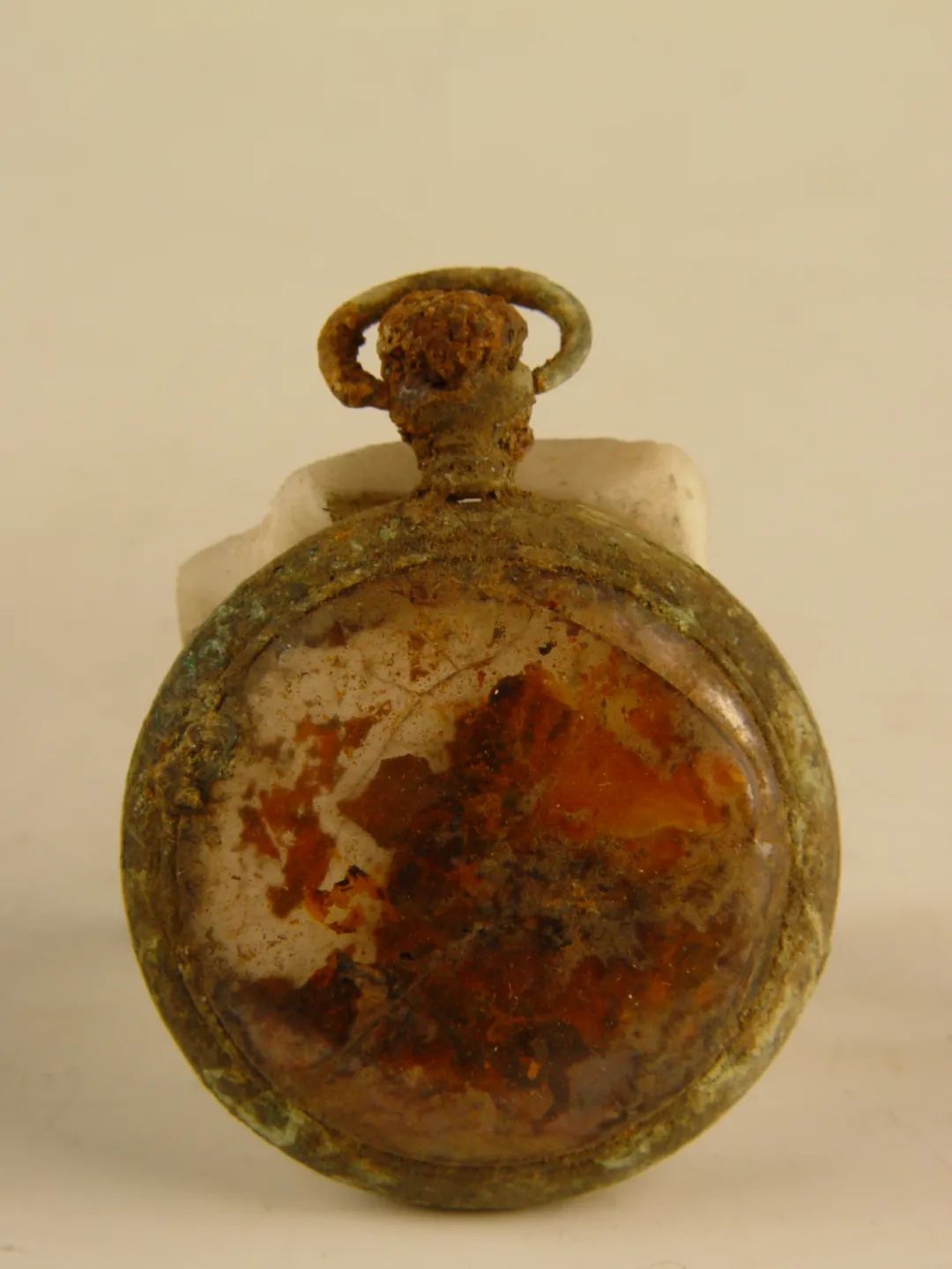 這只懷表于1971年從撫順平頂山慘案遺址出土,表蒙有明顯的裂痕,表盤內已經(jīng)沒有指針。雖然銹蝕嚴重,但仍能看到被火燒過的痕跡。這只沒有指針的懷表,凝固了時間,也凝固了侵華日軍的滔天罪行。