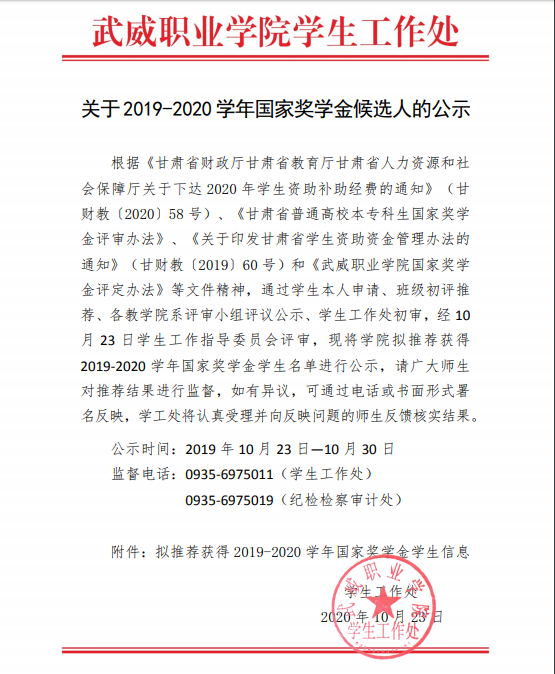關(guān)于2019-2020學(xué)年國家獎(jiǎng)學(xué)金候選人的公示