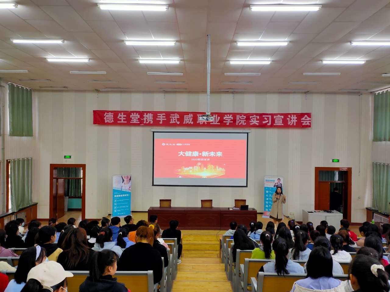 2020年11月5日,武威職業(yè)學(xué)院藥學(xué)系攜手德生堂在正德廳舉辦實(shí)習(xí)宣講會。藥學(xué)系黨總支書記、主任魏潤明、藥學(xué)系副主任楊建美、德生堂集團(tuán)武威區(qū)域經(jīng)理呂福英及2021屆172名畢業(yè)生參加宣講會。