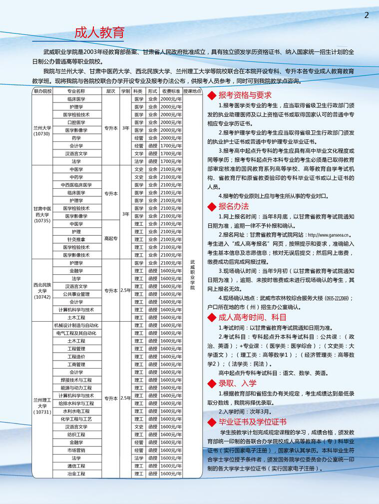 武威職業(yè)學院繼續(xù)教育學院2020年招生簡章