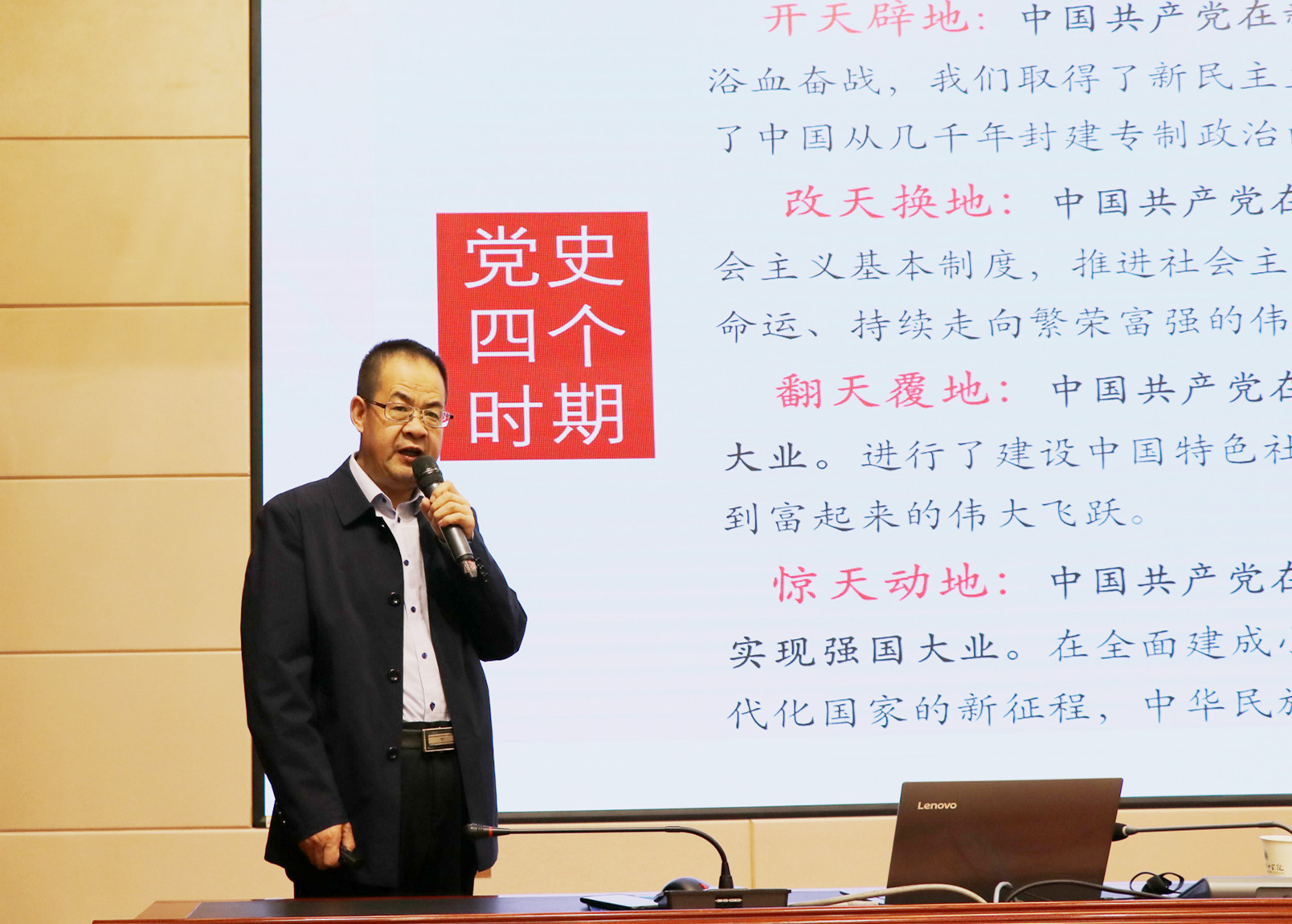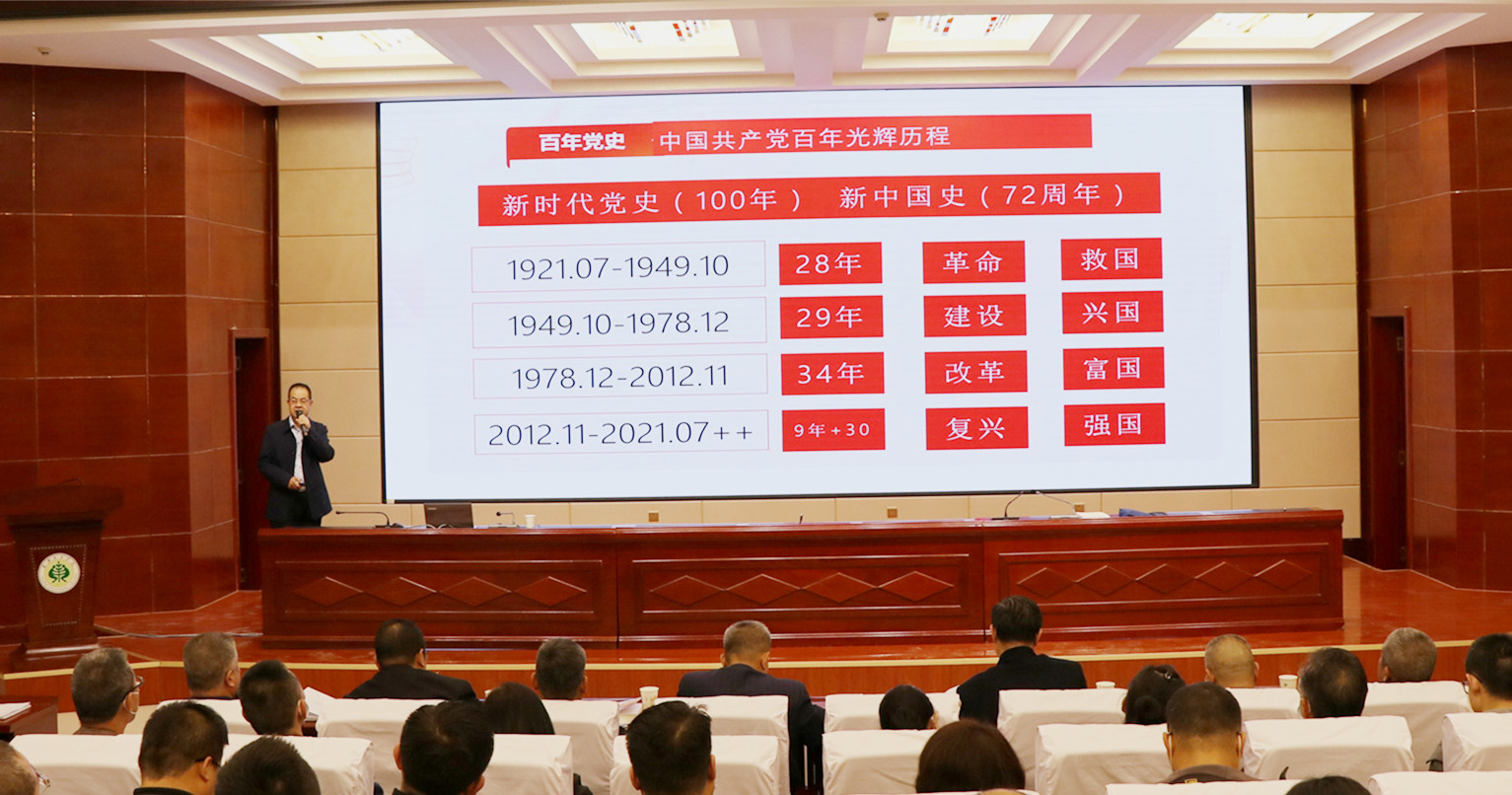 報(bào)告中,翟存祥教授帶領(lǐng)大家再次學(xué)習(xí)了習(xí)近平總書記在黨史學(xué)習(xí)教育動(dòng)員大會(huì)上的講話,進(jìn)一步明確了開(kāi)展黨史學(xué)習(xí)教育的重大意義。報(bào)告將中國(guó)共產(chǎn)黨百年歷程分為“開(kāi)天辟地,新民主主義革命時(shí)期;改天換地,社會(huì)主義革命和建設(shè)時(shí)期;翻天覆地,改革開(kāi)放和現(xiàn)代化建設(shè)時(shí)期;驚天動(dòng)地,中國(guó)特色社會(huì)主義新時(shí)代”四個(gè)歷史發(fā)展階段。從只有中國(guó)共產(chǎn)黨才能拯救中國(guó),中國(guó)人民站起來(lái)了;只有中國(guó)共產(chǎn)黨才能發(fā)展中國(guó),中國(guó)人民富起來(lái)了;只有中國(guó)共產(chǎn)黨才能治理中國(guó),中國(guó)人民強(qiáng)起來(lái)了;堅(jiān)持中國(guó)共產(chǎn)黨的全面領(lǐng)導(dǎo),新中國(guó)取得巨大成就等四個(gè)方面深刻闡述了中國(guó)共產(chǎn)黨百年奮斗的光輝歷程和取得的偉大成就,系統(tǒng)梳理總結(jié)了黨帶領(lǐng)人民推進(jìn)革命、建設(shè)、改革的寶貴經(jīng)驗(yàn)和長(zhǎng)期奮斗中鑄就的偉大精神。