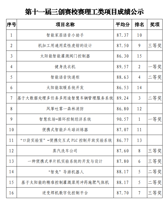 按照第十一屆三創(chuàng)賽省賽組委會(huì)要求,學(xué)院于4月24日在創(chuàng)新創(chuàng)業(yè)中心舉辦了校賽,經(jīng)學(xué)生團(tuán)隊(duì)申報(bào)、現(xiàn)場(chǎng)答辯及專家評(píng)審環(huán)節(jié),校賽已圓滿完成。按照校賽方案,一等獎(jiǎng)不超過(guò)參賽隊(duì)數(shù)的 10%,二等獎(jiǎng)不超過(guò)參賽隊(duì)數(shù)的 20%,三等獎(jiǎng)不超過(guò)參賽隊(duì)數(shù)的 30%。現(xiàn)將第十一屆三創(chuàng)賽校賽獲獎(jiǎng)項(xiàng)目成績(jī)和獲獎(jiǎng)名次予以公示,公示期三日。