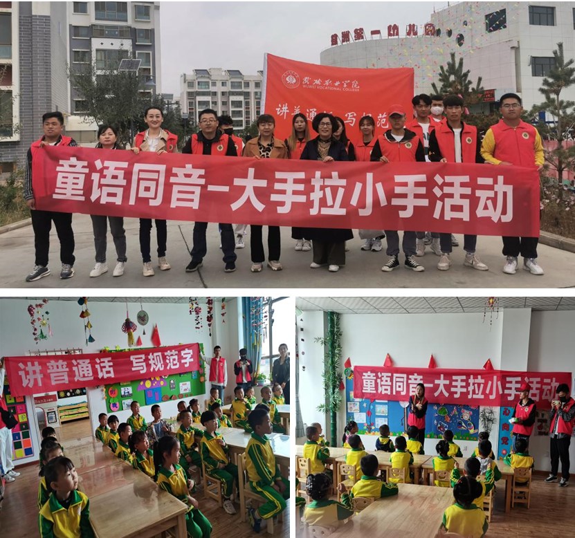 為認真貫徹落實《教育部等九部門關(guān)于開展第24屆全國推廣普通話宣傳周活動的通知》(教語用函〔2021〕1號)、《甘肅省語言文字工作委員會等九部門關(guān)于開展第24屆全國推廣普通話宣傳周活動的通知》要求,進一步加大國家通用語言文字推廣力度,9月14日,學(xué)院推普志愿隊師生在古浪綠洲小鎮(zhèn)第一幼兒園開展童語同音-大手拉小手推普活動,推普志愿隊詳細了解小鎮(zhèn)幼兒教師及兒童的普通話普及情況,并與大、中班幼兒進行了有趣的互動活動。