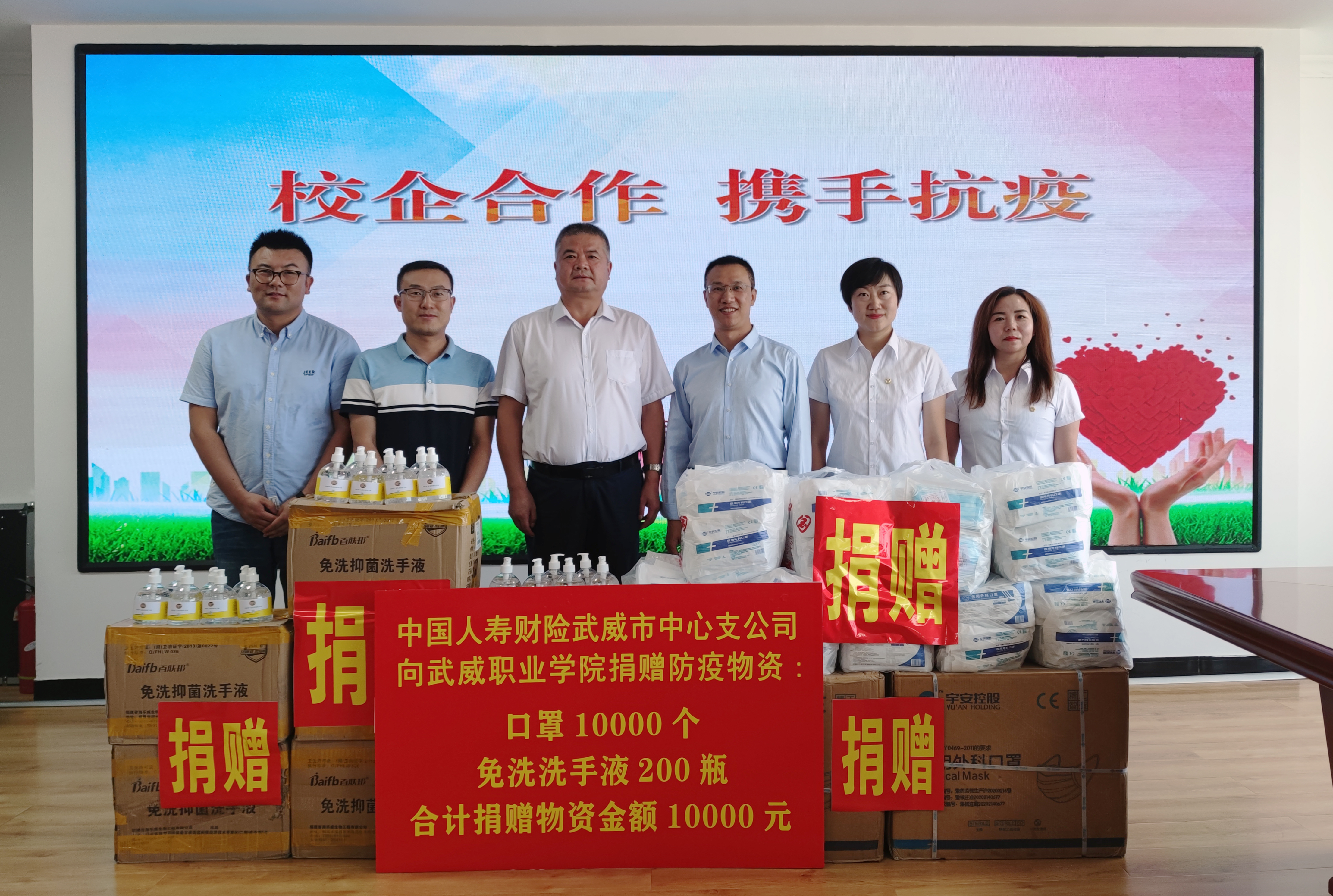 8月28日下午,中國人壽財險武威市中心支公司向學院捐贈口罩10000只、免洗手消毒液200瓶,用于開學報到疫情防控工作。學院黨委委員、副院長王守云,中國人壽財險武威市中心支公司黨委書記、總經(jīng)理姚新明出席捐贈儀式。