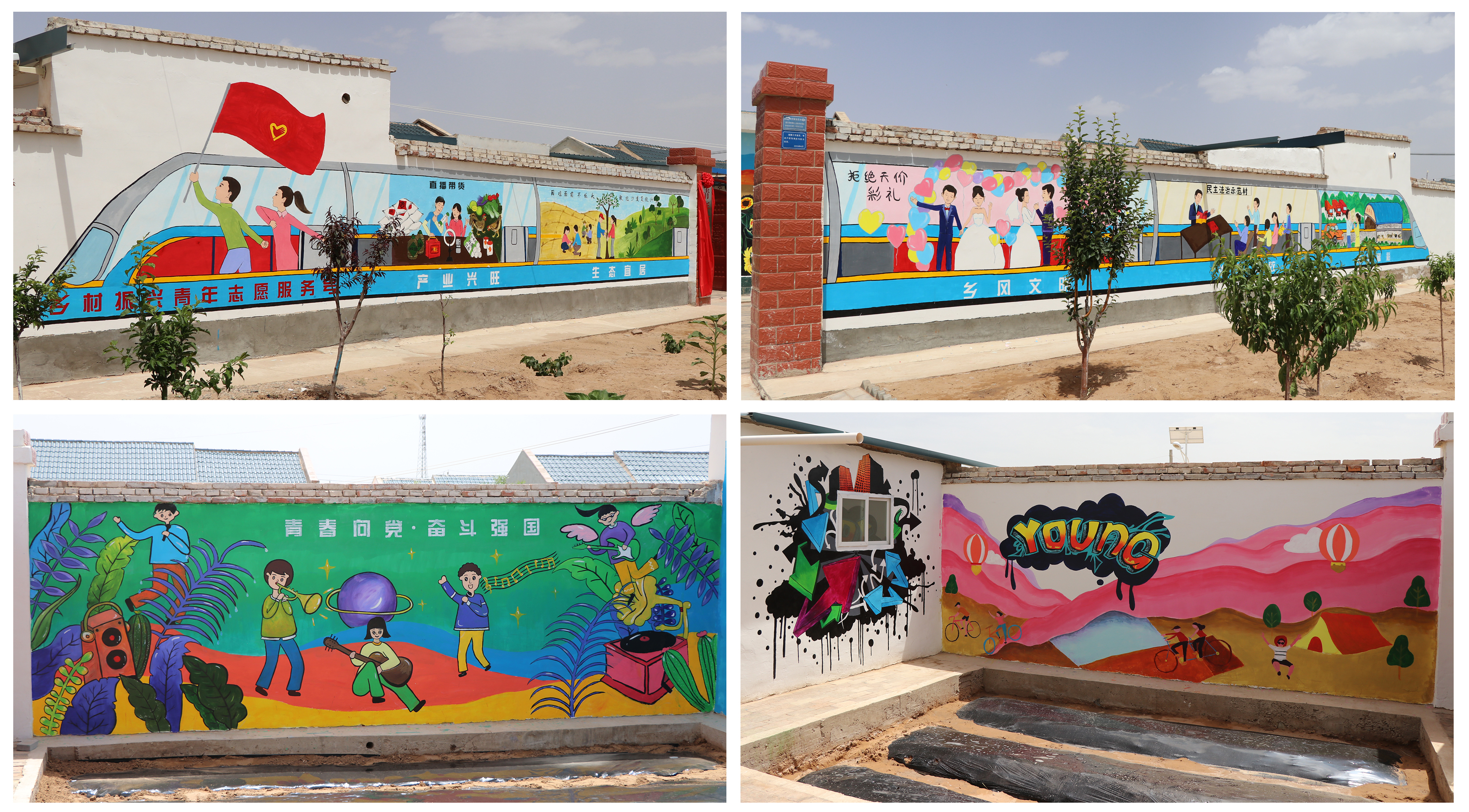 學(xué)院團(tuán)委結(jié)合鄉(xiāng)村振興戰(zhàn)略和青年志愿服務(wù)工作特點(diǎn)對基地內(nèi)外墻體進(jìn)行了彩繪設(shè)計(jì),并組織人文藝術(shù)教育系師生完成了手工繪制。外墻以鄉(xiāng)村振興青年志愿服務(wù)號(hào)高速列車為主題,融入了鄉(xiāng)村振興戰(zhàn)略20字方針,產(chǎn)業(yè)興旺、生態(tài)宜居、鄉(xiāng)風(fēng)文明、治理有效、生活富裕5個(gè)方面的總體目標(biāo)。內(nèi)墻以青春時(shí)尚為主題,利用涂鴉的形式,展現(xiàn)青年人朝氣蓬勃、積極向上,青春向黨、奮斗強(qiáng)國的精神風(fēng)貌。