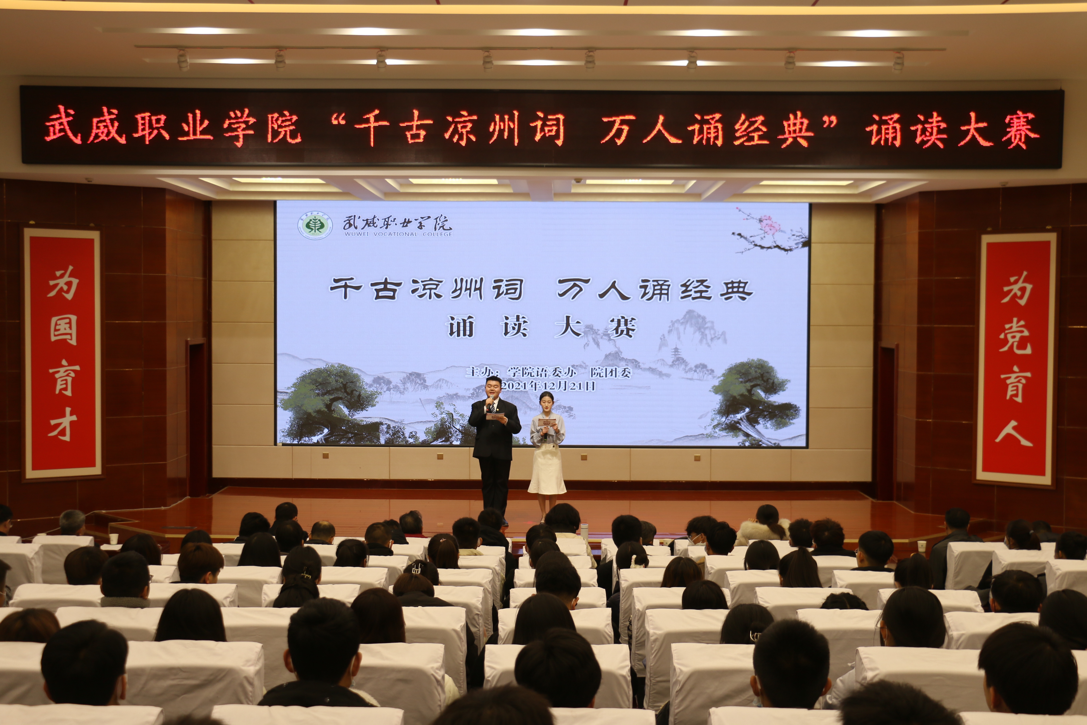 為深化黨史學(xué)習(xí)教育,推進(jìn)“雙高計(jì)劃”建設(shè)任務(wù),弘揚(yáng)涼州文化,傳承絲路精神,助推全國(guó)文明城市創(chuàng)建,營(yíng)造書香校園氛圍,12月21日晚,學(xué)院“千古涼州詞 萬(wàn)人誦經(jīng)典”誦讀大賽在菁英廳舉辦,學(xué)院黨委書記、院長(zhǎng)趙明,黨委委員、副院長(zhǎng)張開(kāi)禮,黨委委員、副院長(zhǎng)王守云出席活動(dòng),各分團(tuán)委書記及學(xué)生代表250余人觀看比賽。