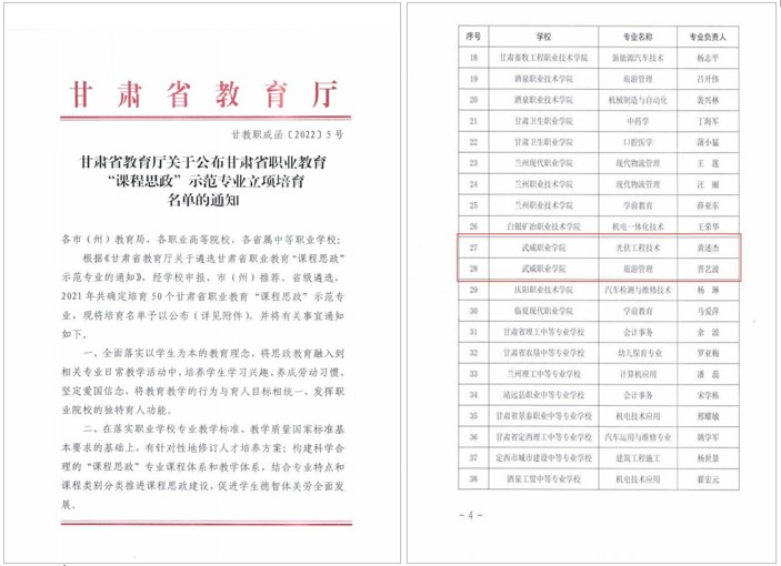 中科低碳新能源技術(shù)學(xué)院黃述杰負(fù)責(zé)的“光伏工程技術(shù)”和經(jīng)濟管理學(xué)院晉藝波負(fù)責(zé)的“旅游管理”2個專業(yè)獲評甘肅省職業(yè)教育“課程思政”示范專業(yè)。