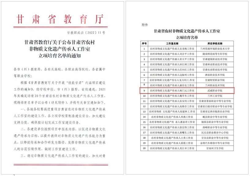 國家級非物質(zhì)文化遺產(chǎn)傳承人、學(xué)校攻鼓子藝術(shù)團指導(dǎo)教師楊門元合作申報的“農(nóng)村非物質(zhì)文化遺產(chǎn)傳承人楊門元工作室”,獲評甘肅省農(nóng)村非物質(zhì)文化遺產(chǎn)傳承人工作室。