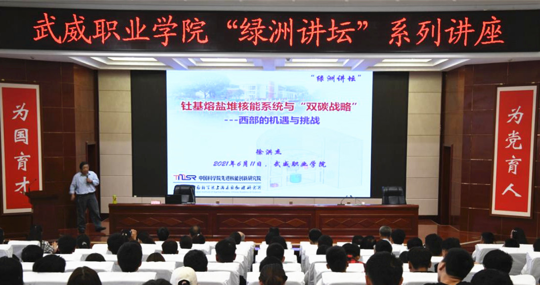 在全院上下深入開展黨史學習教育之際,為進一步推進省級“雙高計劃”建設,促進中科低碳新能源技術學院創(chuàng)新發(fā)展,深化學院教育教學改革,6月11日,學院第45期“綠洲講壇”開講,本次論壇邀請中國科學院上海應用物理研究所研究員、博士生導師兼中國科學院先進核能創(chuàng)新研究院院長徐洪杰為全院師生作題為《基于釷基熔鹽堆的風光核儲多能融合系統(tǒng)——西部“雙碳戰(zhàn)略”之路的機遇和挑戰(zhàn)》的主旨報告。中國科學院上海應用物理研究所黨委書記、副所長趙明華研究員,武威園區(qū)園區(qū)辦主任趙先堂,聯(lián)合辦學主管兼中科低碳新能源技術學院院長助理米麗娟博士出席,學院領導班子成員、中層干部、各院系師生代表共220余人參加報告會。報告會由學院黨委書記、院長趙明主持。