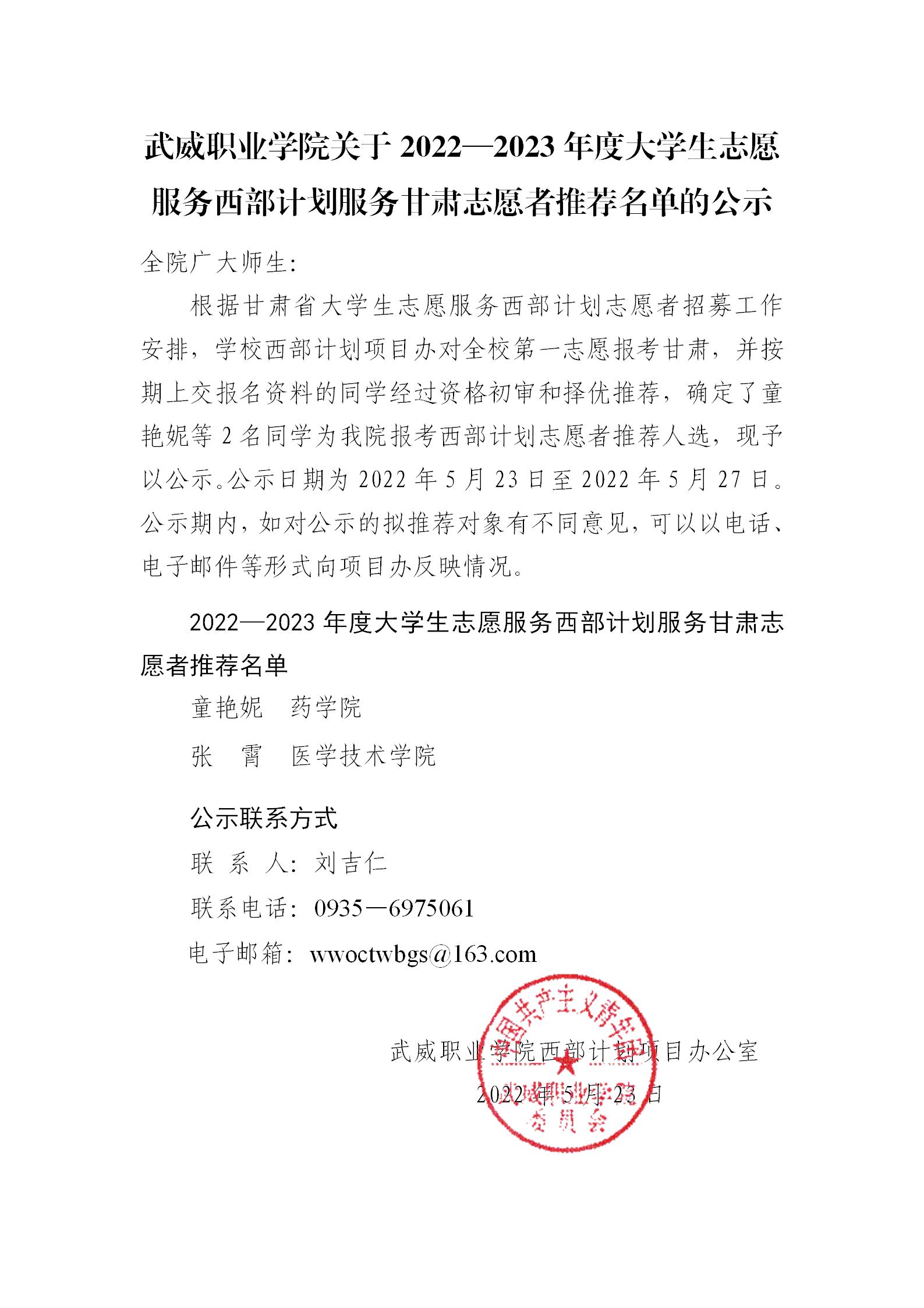 武威職業(yè)學(xué)院關(guān)于2022—2023年度大學(xué)生志愿服務(wù)西部計(jì)劃服務(wù)甘肅志愿者推薦名單的公示