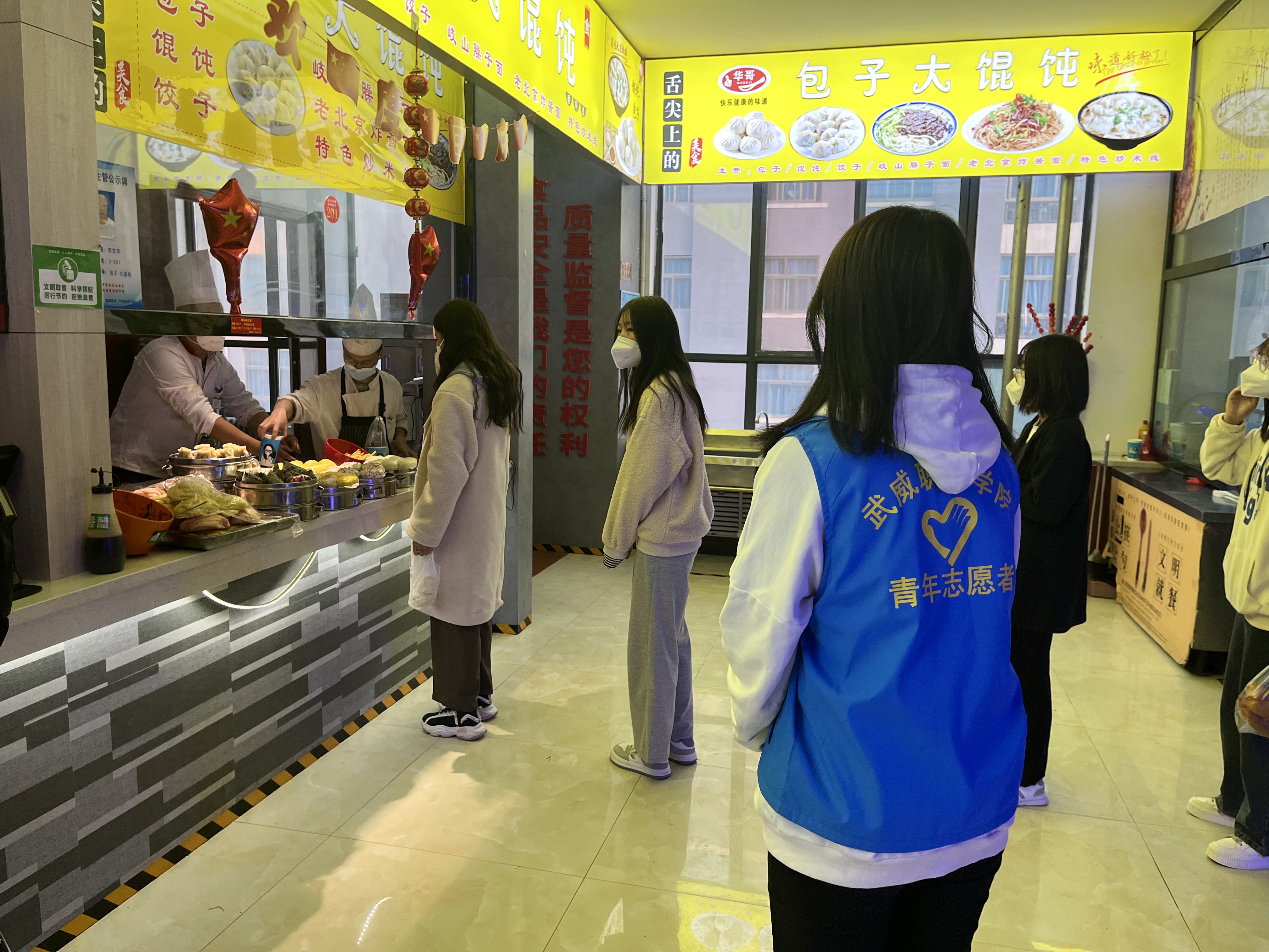 從學(xué)校實(shí)行最小單元宿舍管理開始,各學(xué)生組織工作人員分批次、不間斷、輪流值守,他們主動亮身份、帶頭當(dāng)先鋒,在校園食堂、水房、超市等人流容易聚集的地方,每天安排志愿者在人流高峰時間段排班站崗,勸導(dǎo)同學(xué)們遵守疫情防控一米線,不扎堆不聚集,積極佩戴好口罩,做好個人防護(hù)工作,確保同學(xué)們吃飯、購物、打水健康有序進(jìn)行。在對可能傳入疫情的校園圍欄處開展值守勸阻工作,積極勸導(dǎo)學(xué)生不購買社會面商品,堅決杜絕疫情從社會傳入校園,將學(xué)校疫情防控各項措施落細(xì)落實(shí),切實(shí)扛起校園疫情防控責(zé)任。一件件“藍(lán)馬甲”活躍在校園每個角落,服務(wù)同學(xué)的身影從未間斷,成為校園里一道靚麗的風(fēng)景線,用實(shí)際行動詮釋了新時代武職學(xué)子的責(zé)任與擔(dān)當(dāng)。