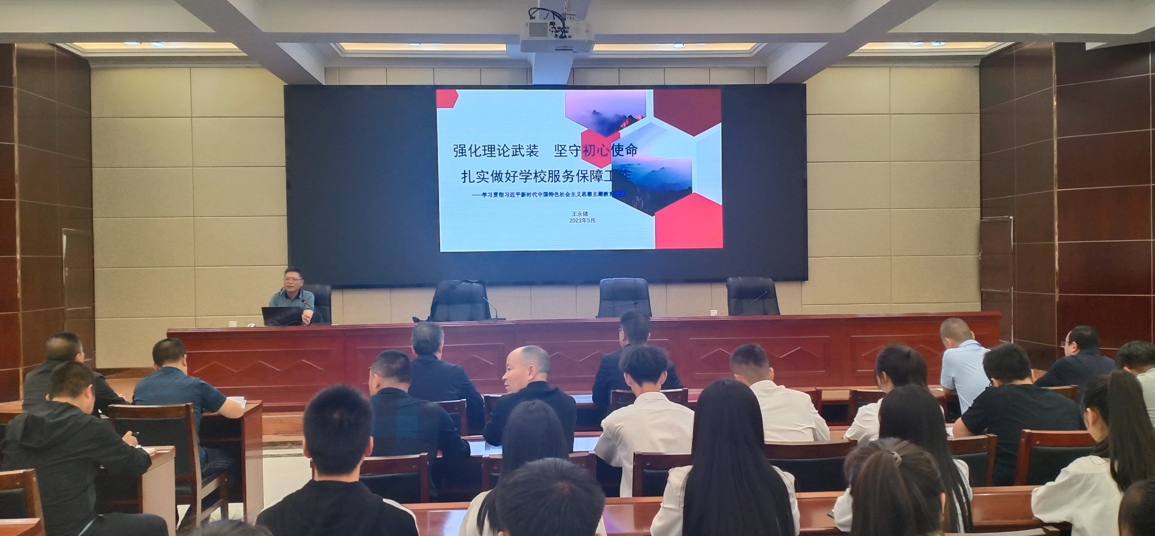 5月30日,學(xué)校黨委委員、副校長王永緒以《強化理論武裝?堅守初心使命——扎實做好學(xué)校服務(wù)保障工作》為題,在學(xué)校行樹樓北側(cè)學(xué)術(shù)報告廳講授學(xué)習(xí)貫徹習(xí)近平新時代中國特色社會主義思想主題教育專題黨課。信息技術(shù)學(xué)院全體師生黨員參加黨課學(xué)習(xí)。