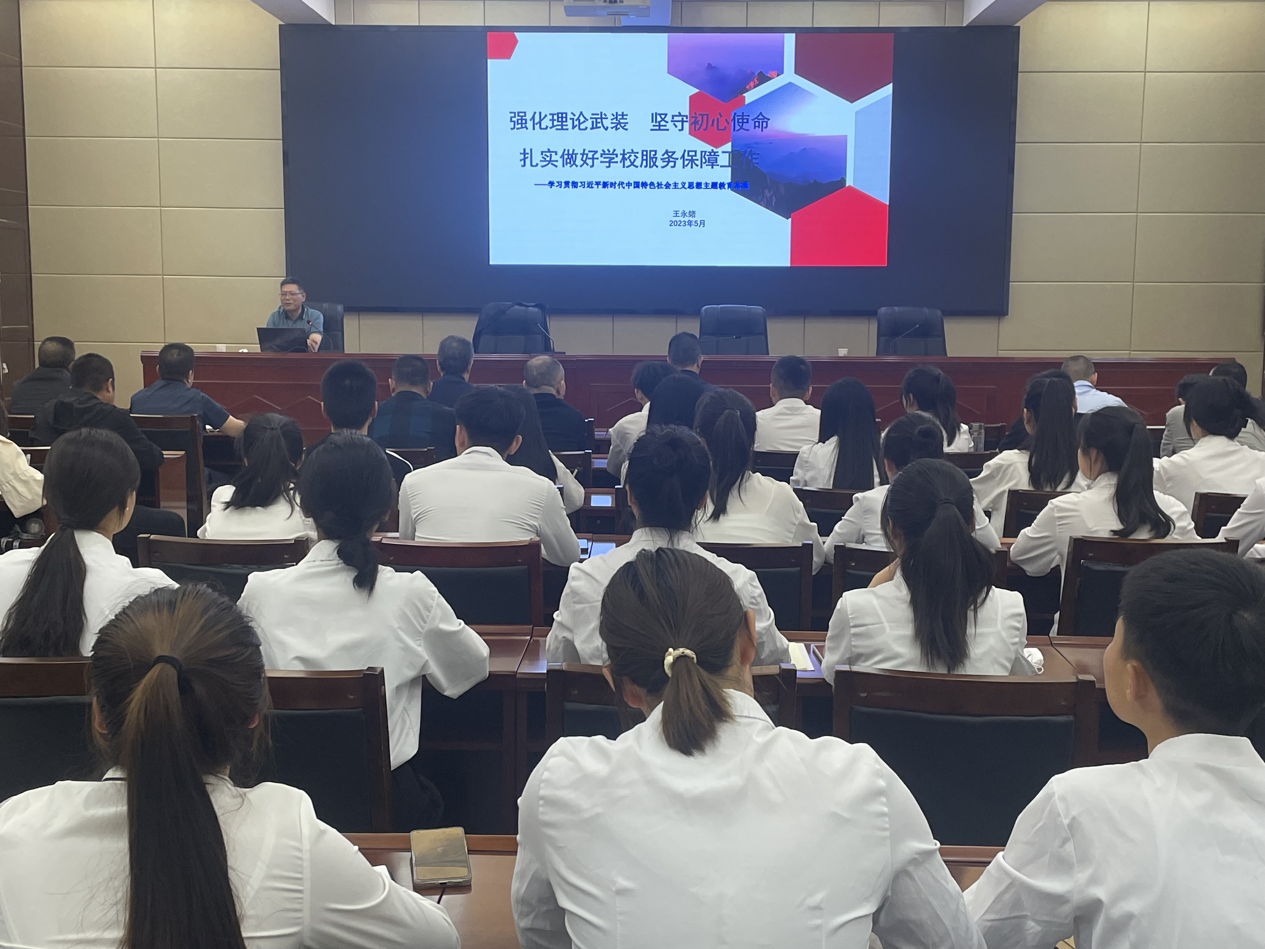 按照學(xué)校黨委關(guān)于學(xué)習(xí)貫徹習(xí)近平新時(shí)代中國(guó)特色社會(huì)主義思想主題教育的部署安排,5月31日,學(xué)校黨委委員、副校長(zhǎng)王永緒講授了題為《強(qiáng)化理論武裝? 堅(jiān)守初心使命》的專題黨課,后勤管理處、基建處、國(guó)有資產(chǎn)管理處、護(hù)理學(xué)院和信息技術(shù)學(xué)院全體黨員、預(yù)備黨員、發(fā)展對(duì)象等80余人聆聽(tīng)了黨課。