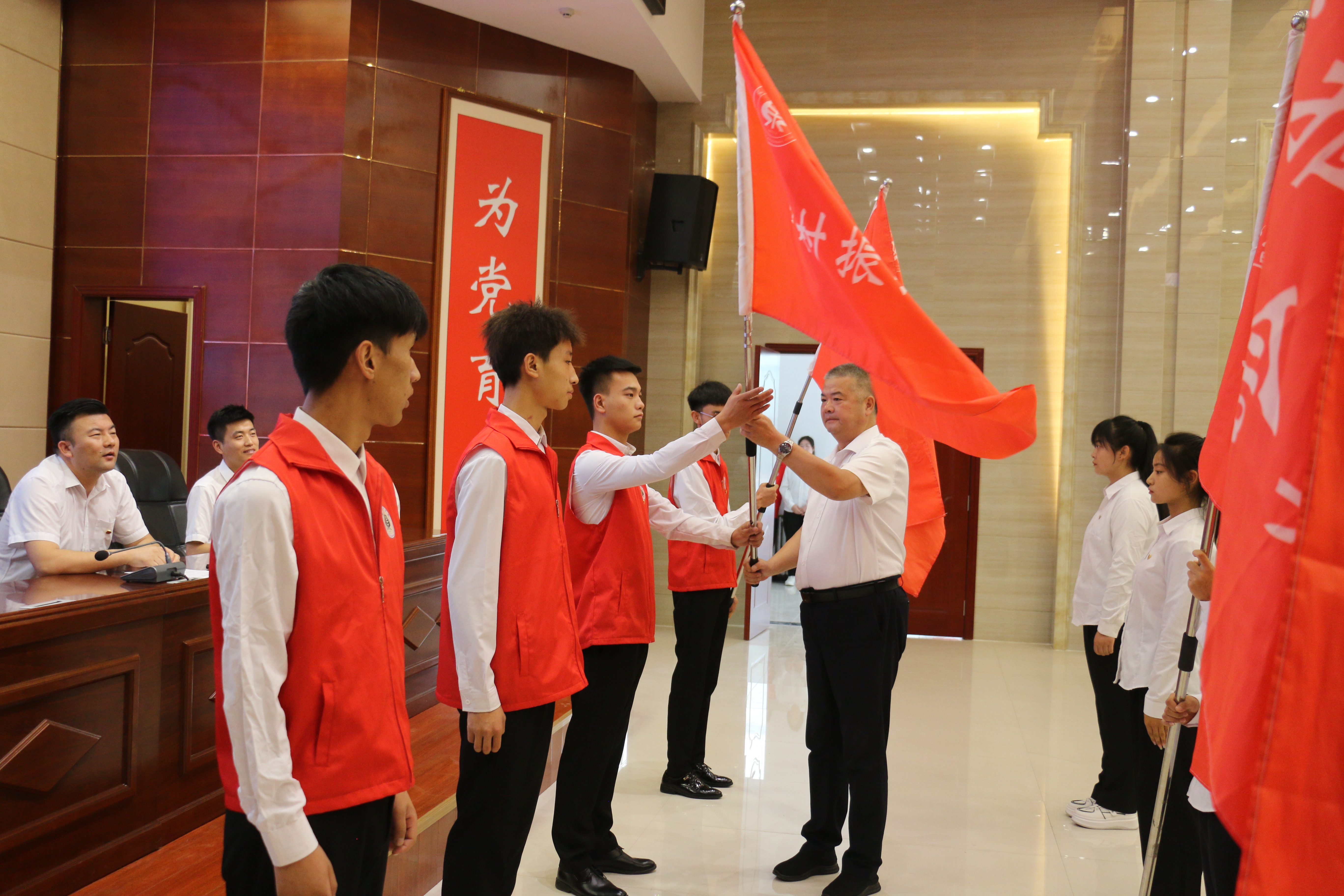 王守云為各實(shí)踐服務(wù)團(tuán)隊(duì)授旗。志愿者代表候昊燁代表全體隊(duì)員莊嚴(yán)承諾,遵守紀(jì)律,克服困難,團(tuán)結(jié)協(xié)作,全力以赴,力爭圓滿地完成預(yù)定的各項(xiàng)實(shí)踐任務(wù)。指導(dǎo)教師代表姚盈老師發(fā)言,介紹了“直播帶貨-非遺傳承”鄉(xiāng)村振興促進(jìn)團(tuán)的實(shí)踐計(jì)劃情況,號召老師和同學(xué)們深入基層一線,用腳步丈量祖國大地,用眼睛發(fā)現(xiàn)中國精神,用耳朵傾聽人民呼聲,用內(nèi)心感應(yīng)時(shí)代脈搏。