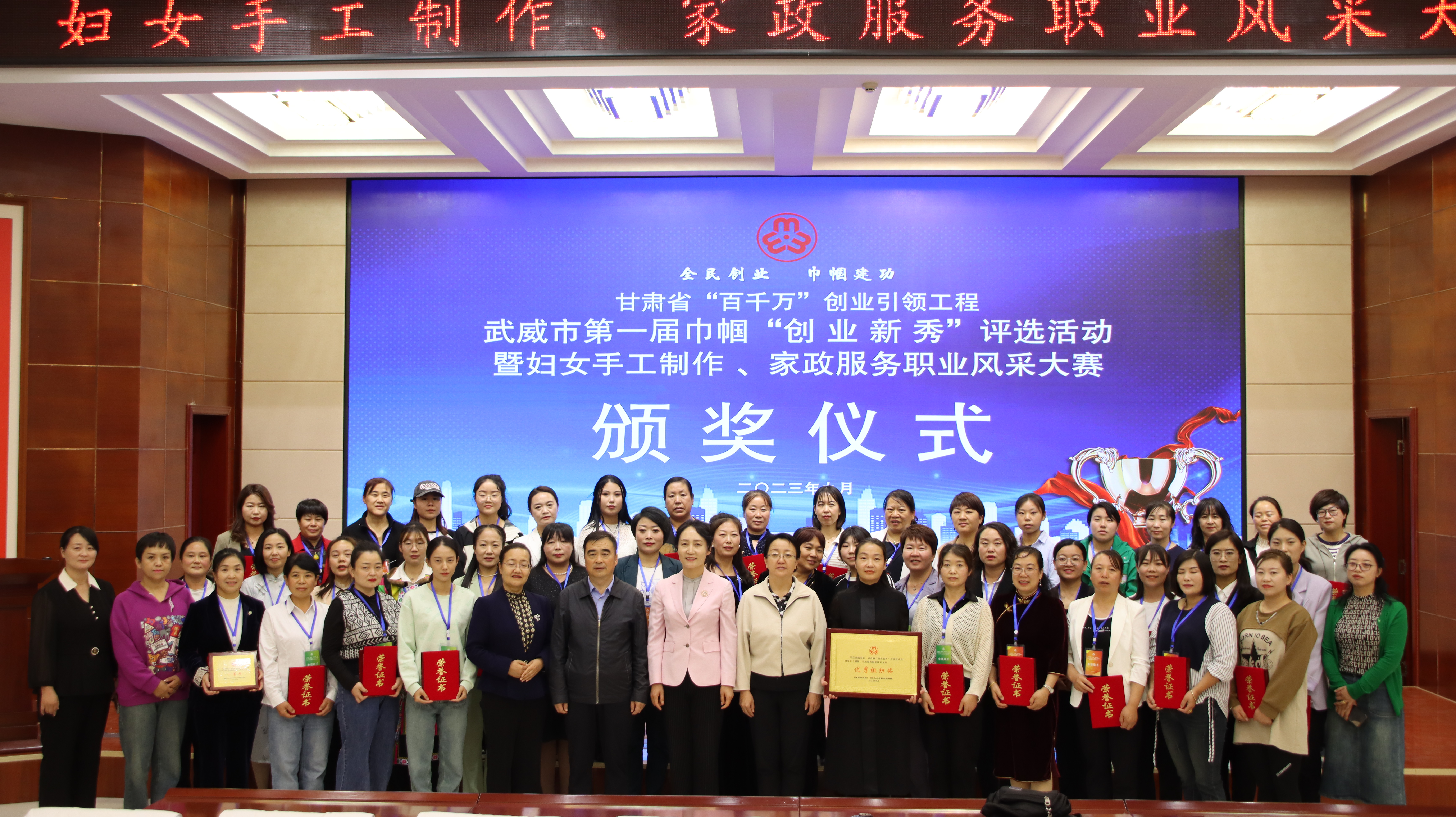 9 月 27 日,由市婦聯(lián)、市人社局主辦、我校承辦的甘肅省“百千萬(wàn)”創(chuàng)業(yè)引領(lǐng)工程武威市第一屆巾幗“創(chuàng)業(yè)新秀”評(píng)選活動(dòng)暨婦女手工制作、家政服務(wù)職業(yè)風(fēng)采大賽成功舉辦,武威市人社局黨組書(shū)記,局長(zhǎng)陳昱川,市婦聯(lián)黨組書(shū)記,主席劉玉華,武威市就業(yè)局局長(zhǎng)魏斌,武威市婦聯(lián)副主席張惠華,縣區(qū)婦聯(lián)負(fù)責(zé)同志,學(xué)校黨委委員,副校長(zhǎng)田迎春出席本次活動(dòng),參賽選手等100 人參加大賽。