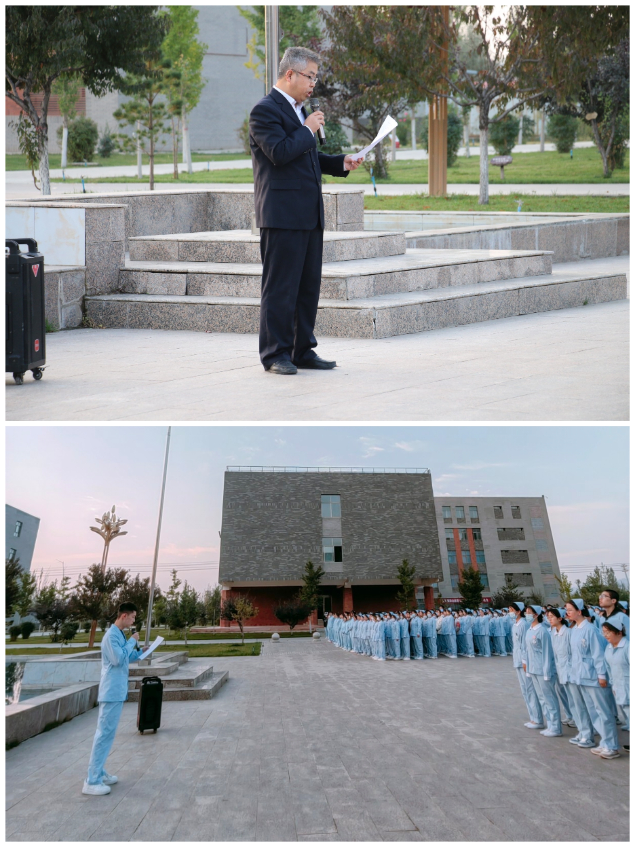 10月9日清晨,護理學院在圖書館前廣場舉行升國旗儀式,學院黨總支書記張建輝、團委書記楊杰、全體班主任及2022、2023級全體學生參加此次升旗儀式,儀式由楊杰主持。