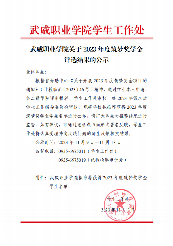 武威職業(yè)學院關(guān)于2023年度筑夢獎學金評選結(jié)果的公示