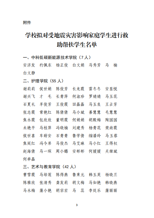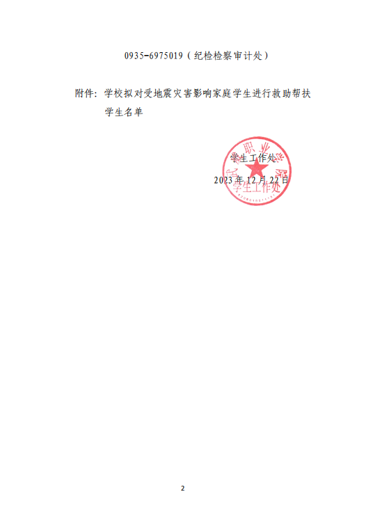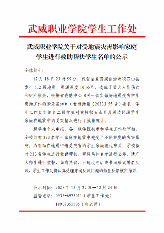 武威職業(yè)學院關于對受地震災害影響家庭學生進行救助幫扶學生名單的公示