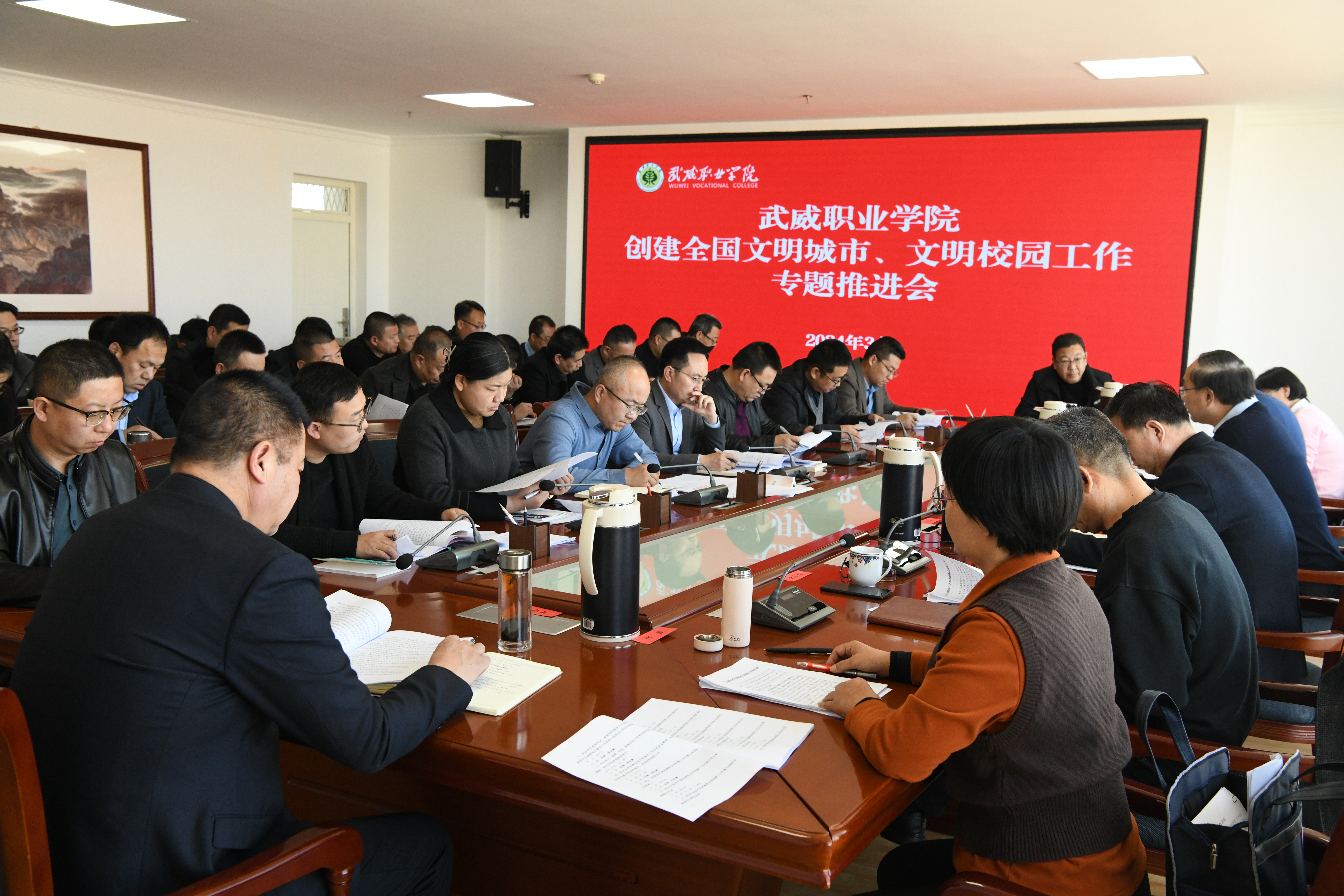 根據(jù)“武威市創(chuàng)建全國(guó)文明城市工作動(dòng)員大會(huì)”精神,3月8日下午,學(xué)校在能源科技樓811會(huì)議室召開(kāi)了2024年創(chuàng)建全國(guó)文明城市、文明校園專題工作推進(jìn)會(huì)。黨委書(shū)記王宏,校長(zhǎng)、副書(shū)記張開(kāi)禮,黨委副書(shū)記翟存祥,副校長(zhǎng)王永緒、田迎春、何毅,紀(jì)委書(shū)記、監(jiān)察專員陳曉煜,副校長(zhǎng)王守云出席會(huì)議,各黨總支、直屬黨支部書(shū)記,各部門(mén)、二級(jí)學(xué)院負(fù)責(zé)人參加會(huì)議。會(huì)議由黨委書(shū)記王宏主持并作了講話。