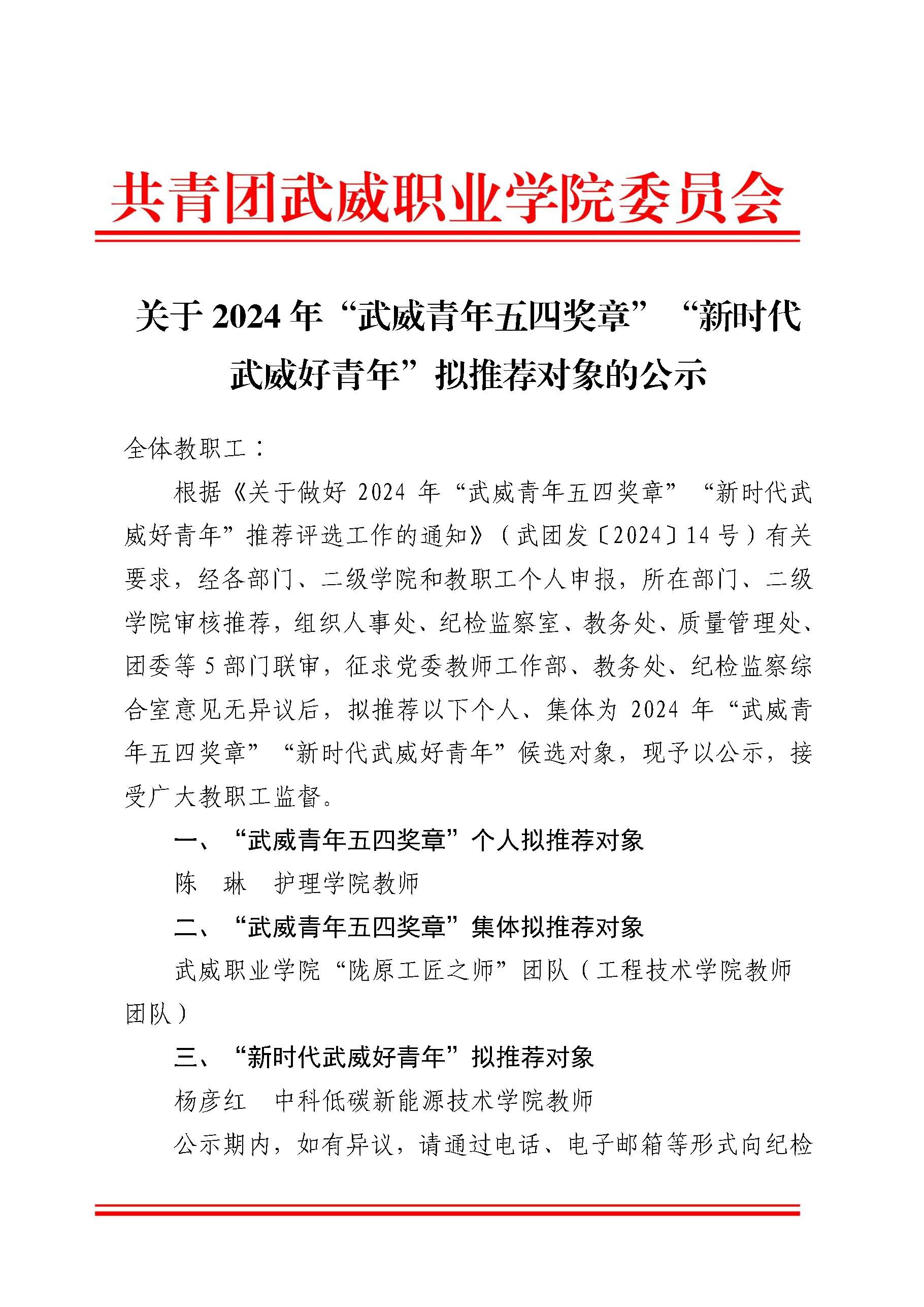 關(guān)于2024年“武威青年五四獎(jiǎng)?wù)隆啊毙聲r(shí)代武威好青年“擬推薦對象的公示
