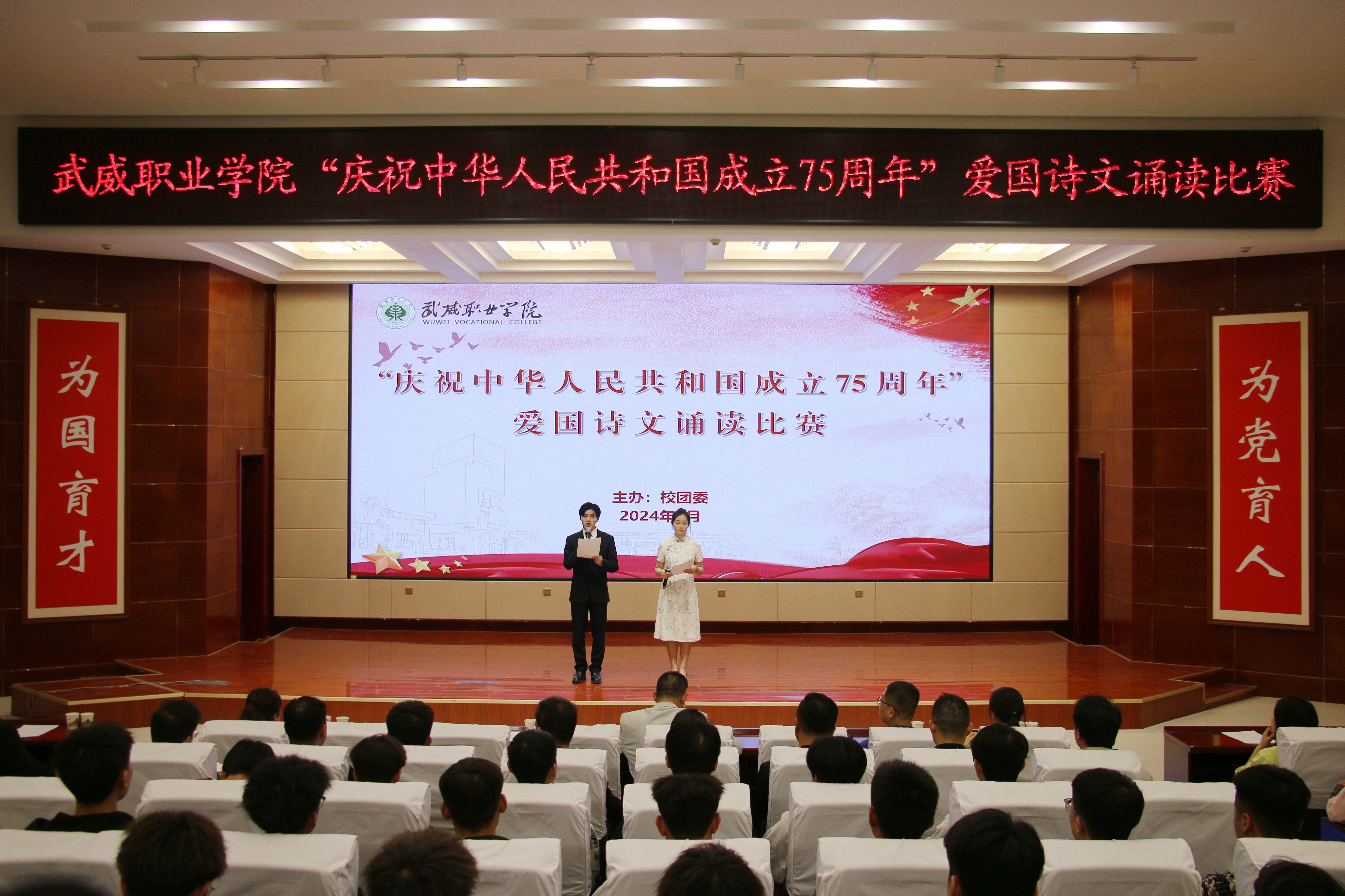 4月25日晚,學(xué)?!凹o(jì)念‘五四’運(yùn)動(dòng)105周年暨慶祝新中國成立75周年”愛國詩文誦讀比賽在菁英廳舉辦。黨委委員、副校長王守云出席活動(dòng),各二級(jí)學(xué)院團(tuán)委書記及學(xué)生代表220余人觀看比賽。
