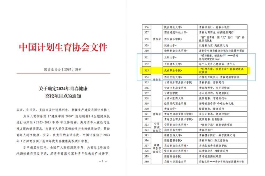 日前,中國(guó)計(jì)劃生育協(xié)會(huì)發(fā)布《關(guān)于確定2024年青春健康高校項(xiàng)目點(diǎn)的通知》,我校學(xué)生工作部、校團(tuán)委、護(hù)理學(xué)院共同申報(bào)的“花樣年華,珍愛生命”項(xiàng)目,從全國(guó)各地500余所高校中脫穎而出,自2022年以來連續(xù)三次成功中標(biāo)中國(guó)計(jì)生協(xié)專項(xiàng)資助A類項(xiàng)目,成為甘肅省中標(biāo)A類項(xiàng)目院校中唯一一所高職院校。