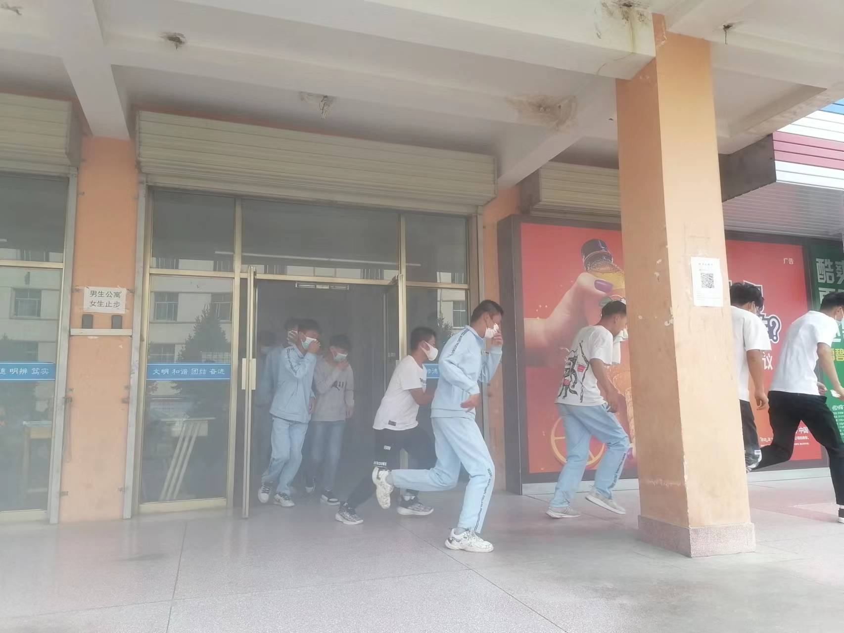 15時20分,疏散演練正式開始。隨著火災(zāi)警報響起,安全保衛(wèi)工作人員點燃煙餅,在學(xué)生公寓樓模擬火災(zāi)現(xiàn)場,冒出滾滾濃煙,公寓管理人員迅速組織學(xué)生有序疏散。在輔導(dǎo)員、班主任的引導(dǎo)下,同學(xué)們按照動作要領(lǐng),用濕毛巾捂住口鼻,俯身彎腰按照安全出口指示牌快速、有序從疏散通道撤離到體育場,整個過程緊張有序,實用性強(qiáng),達(dá)到了預(yù)期效果。