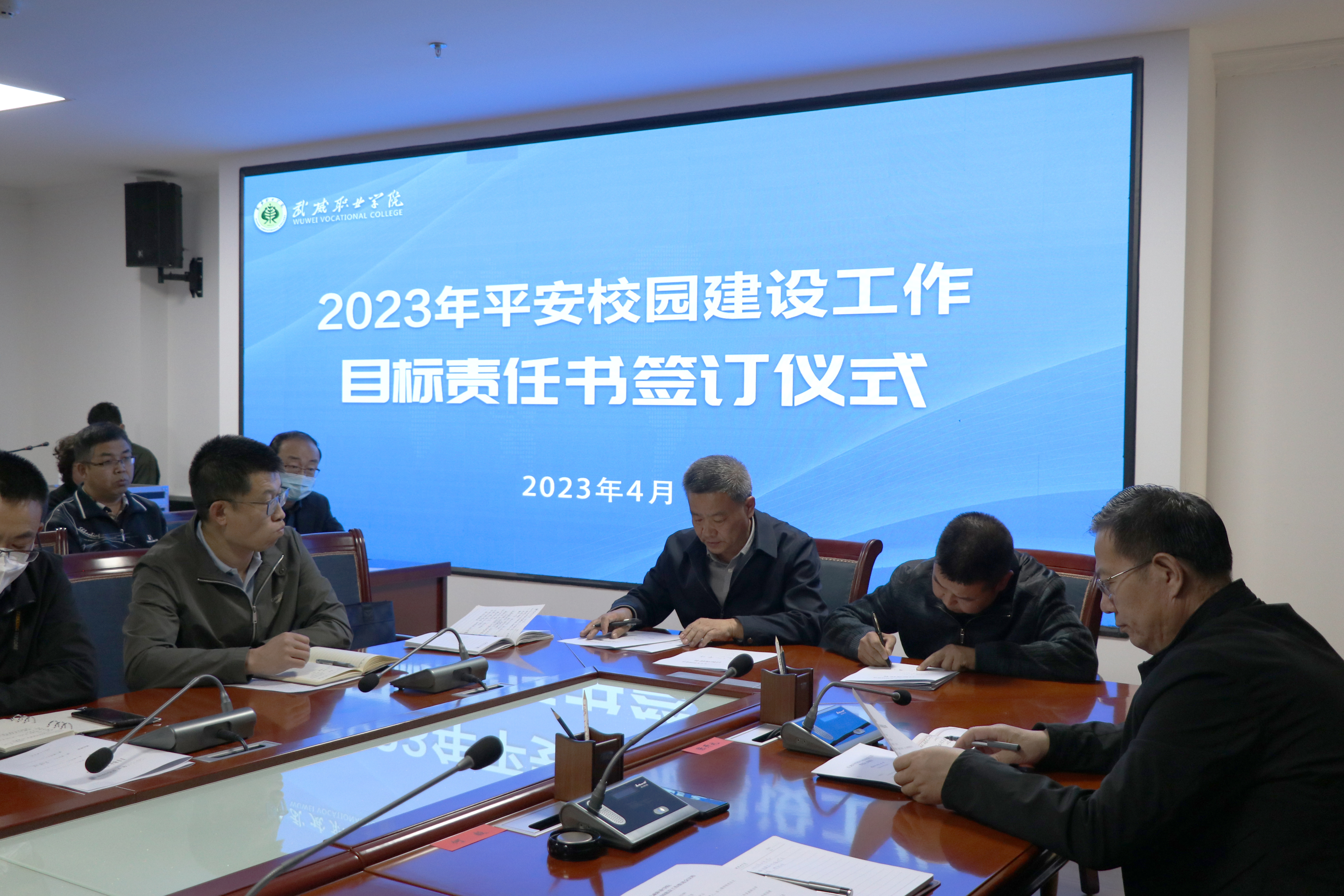 趙明與各部門、二級學院簽訂了2023年平安校園建設(shè)工作目標責任書。王守云結(jié)合學校實際,對2023年平安校園建設(shè)工作作了安排。