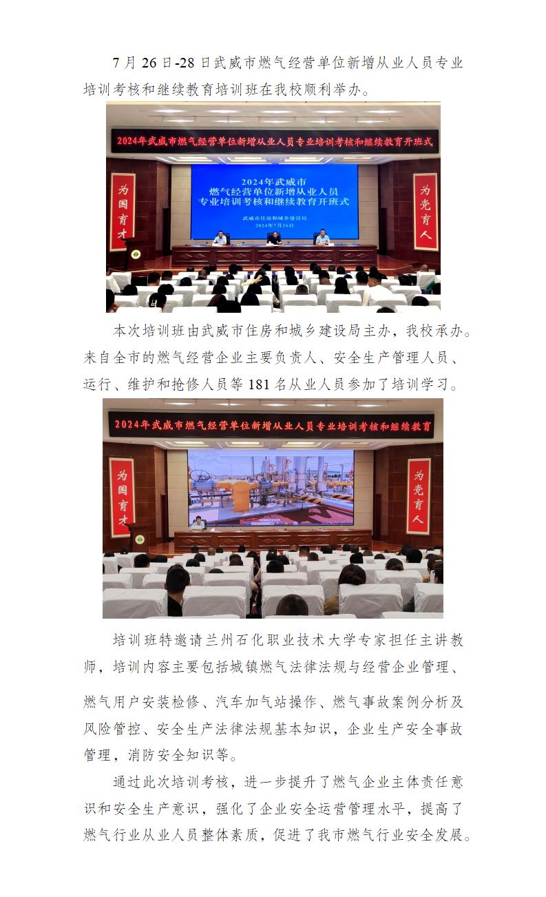 2024年武威市燃?xì)饨?jīng)營(yíng)單位新增從業(yè)人員專業(yè)培訓(xùn)考核和繼續(xù)教育培訓(xùn)班在我校成功舉辦