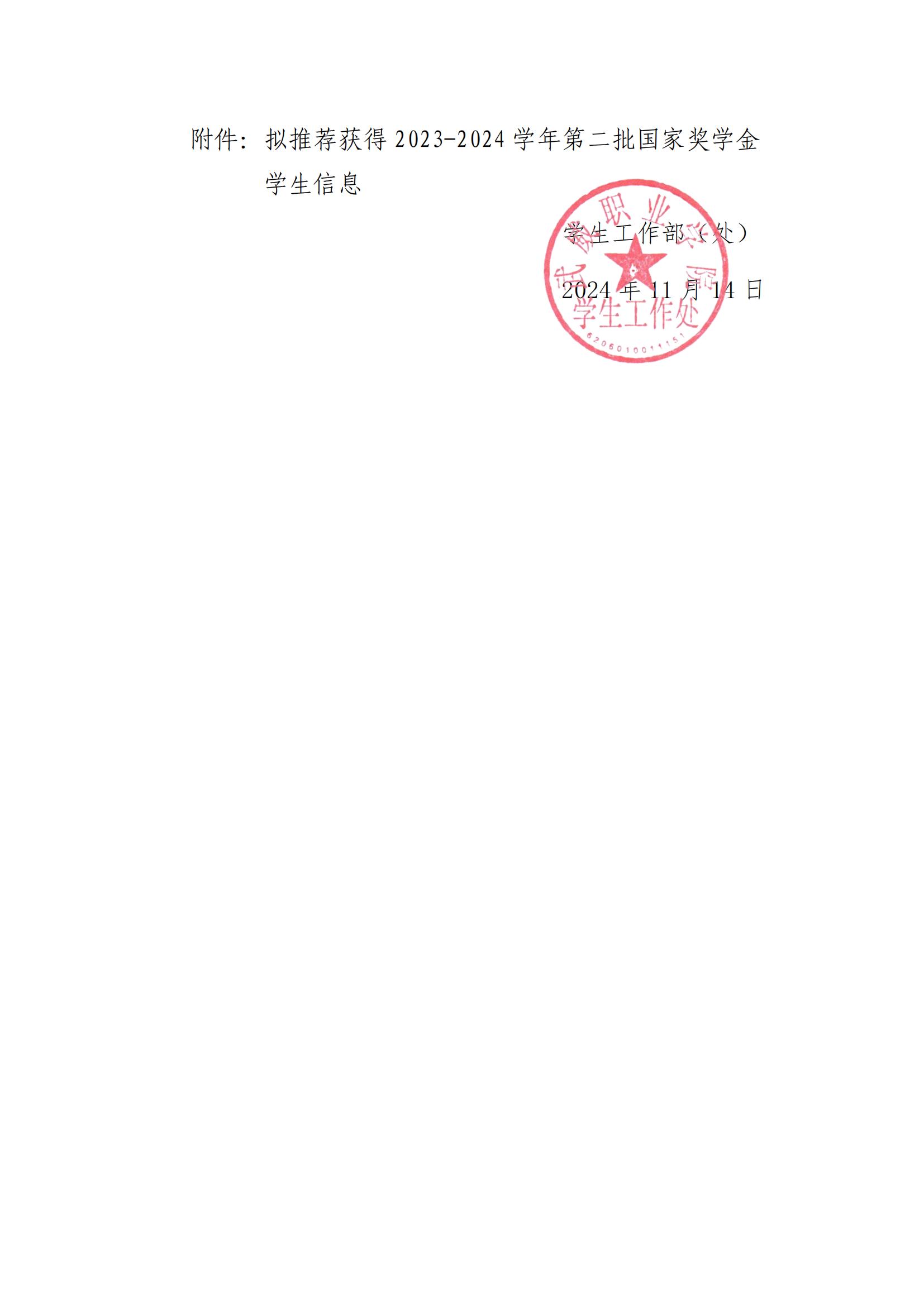武威職業(yè)學(xué)院關(guān)于2023-2024學(xué)年第二批國家獎學(xué)金擬獲得者的公示