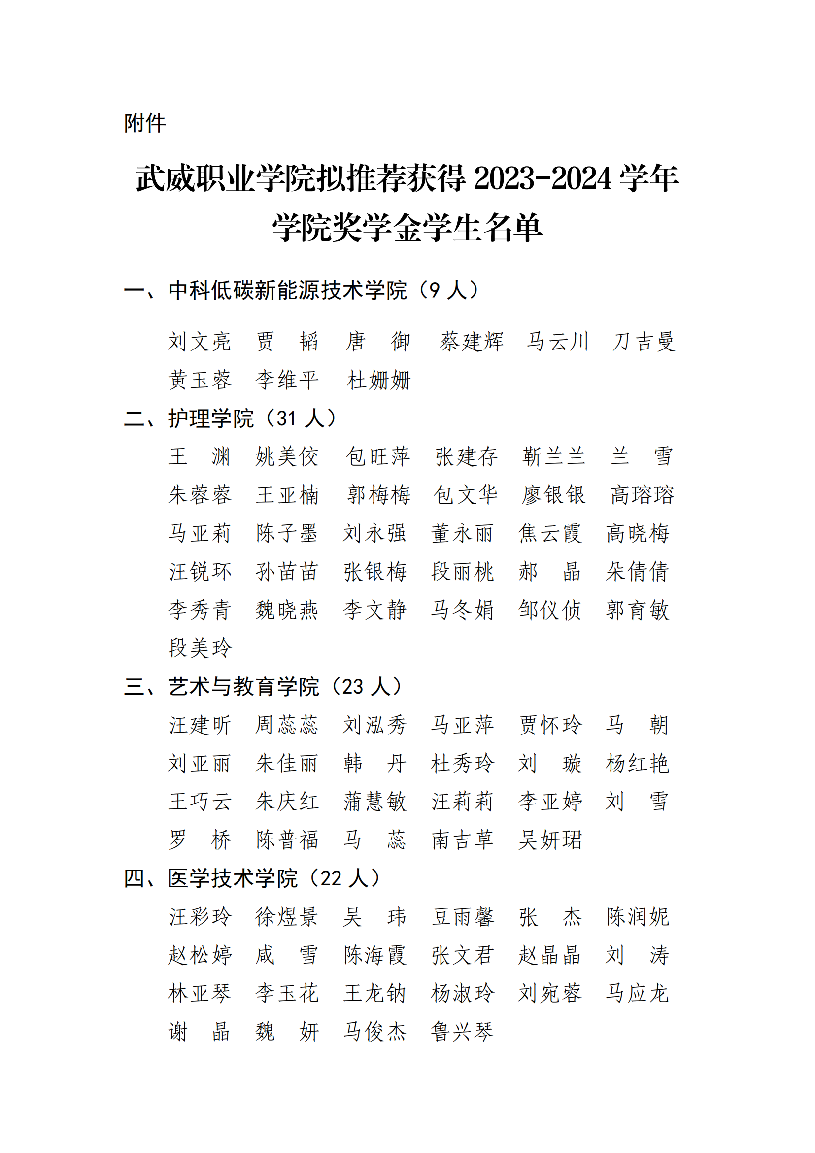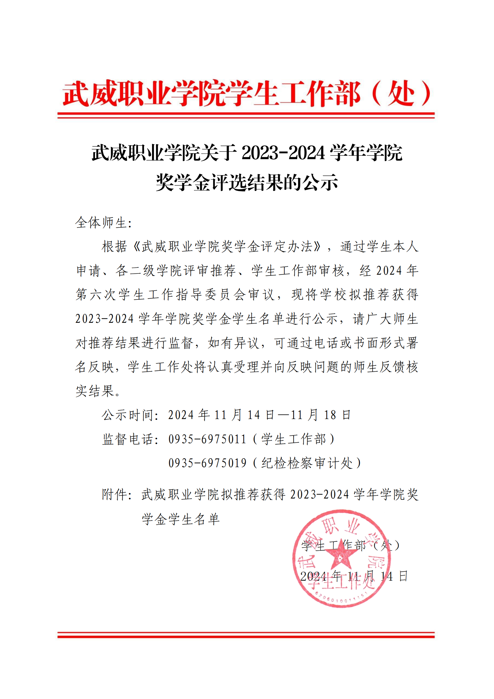 武威職業(yè)學院關于2023-2024學年學院獎學金評選結果的公示