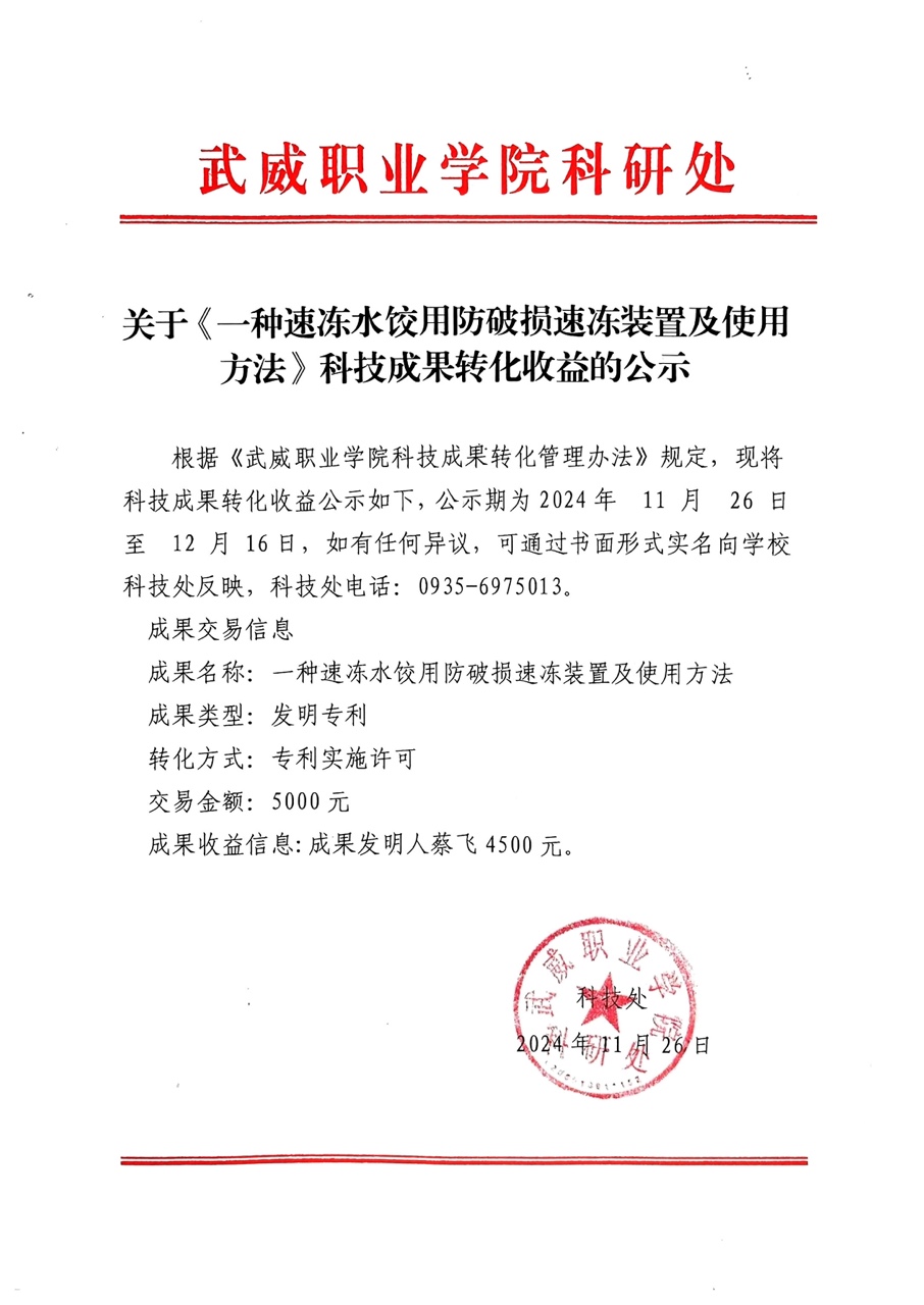 關(guān)于《一種速凍水餃用防破損速凍裝置及使用方法》科技成果轉(zhuǎn)化收益的公示