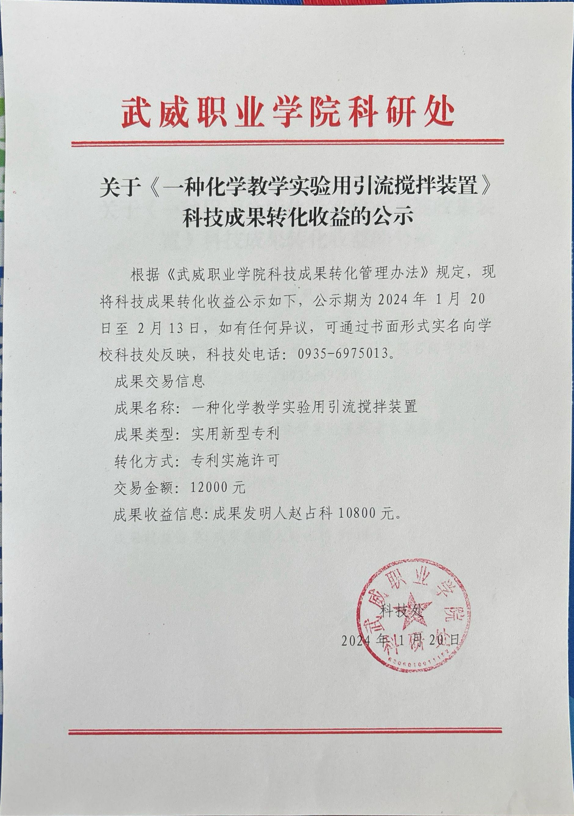 關于《一種化學教學實驗用引流攪拌裝置》科技成果轉化收益的公示