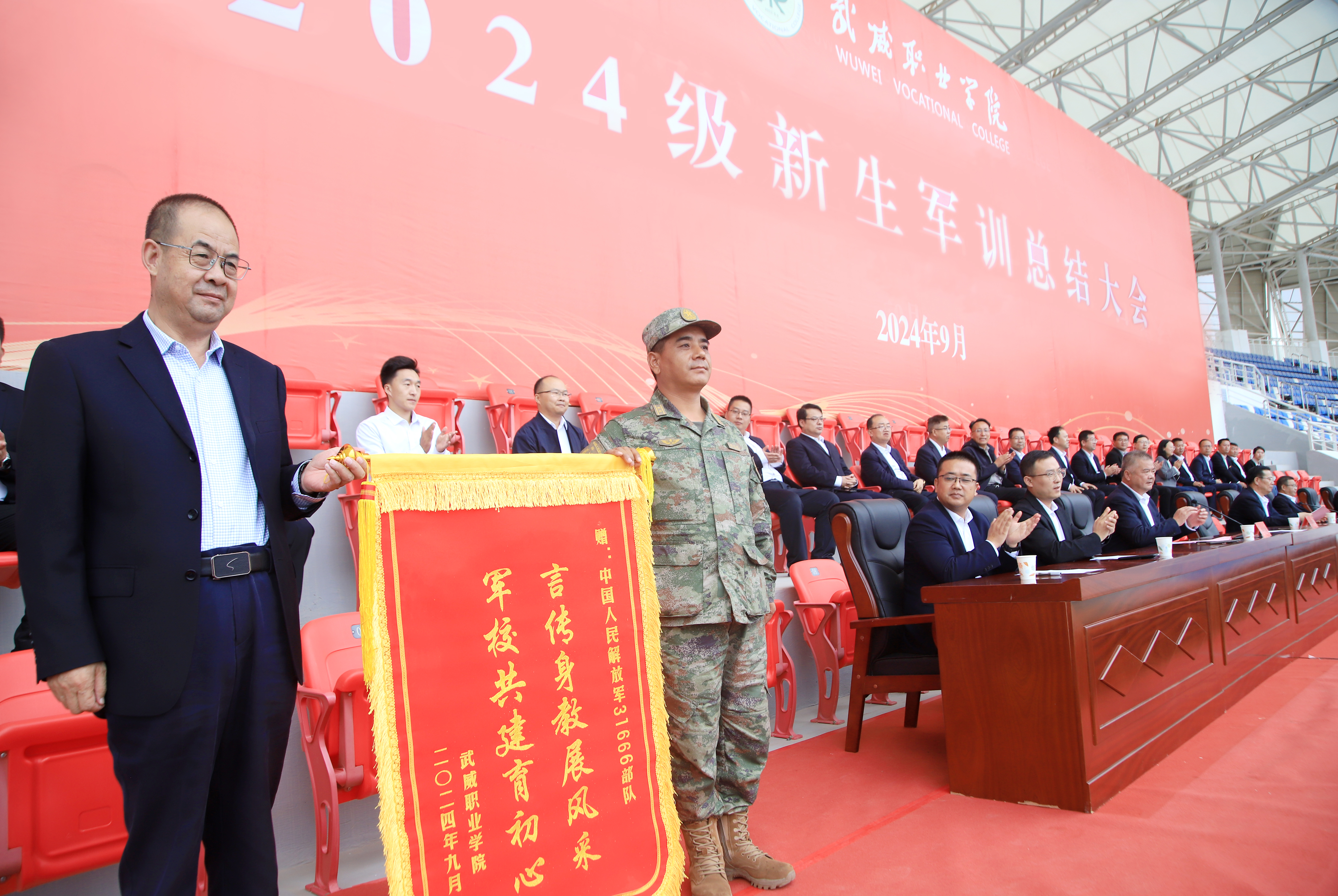 會(huì)上,翟存祥代表學(xué)校向承訓(xùn)部隊(duì)贈(zèng)送錦旗致以崇高的敬意,向奮戰(zhàn)在訓(xùn)練一線的軍訓(xùn)教官及工作人員表示衷心的感謝!陳曉煜宣讀了2024級(jí)新生軍訓(xùn)工作先進(jìn)集體、先進(jìn)個(gè)人、優(yōu)秀教官和軍訓(xùn)標(biāo)兵擬表彰名單。與會(huì)領(lǐng)導(dǎo)為軍訓(xùn)先進(jìn)集體和個(gè)人頒發(fā)了獎(jiǎng)牌和榮譽(yù)證書。