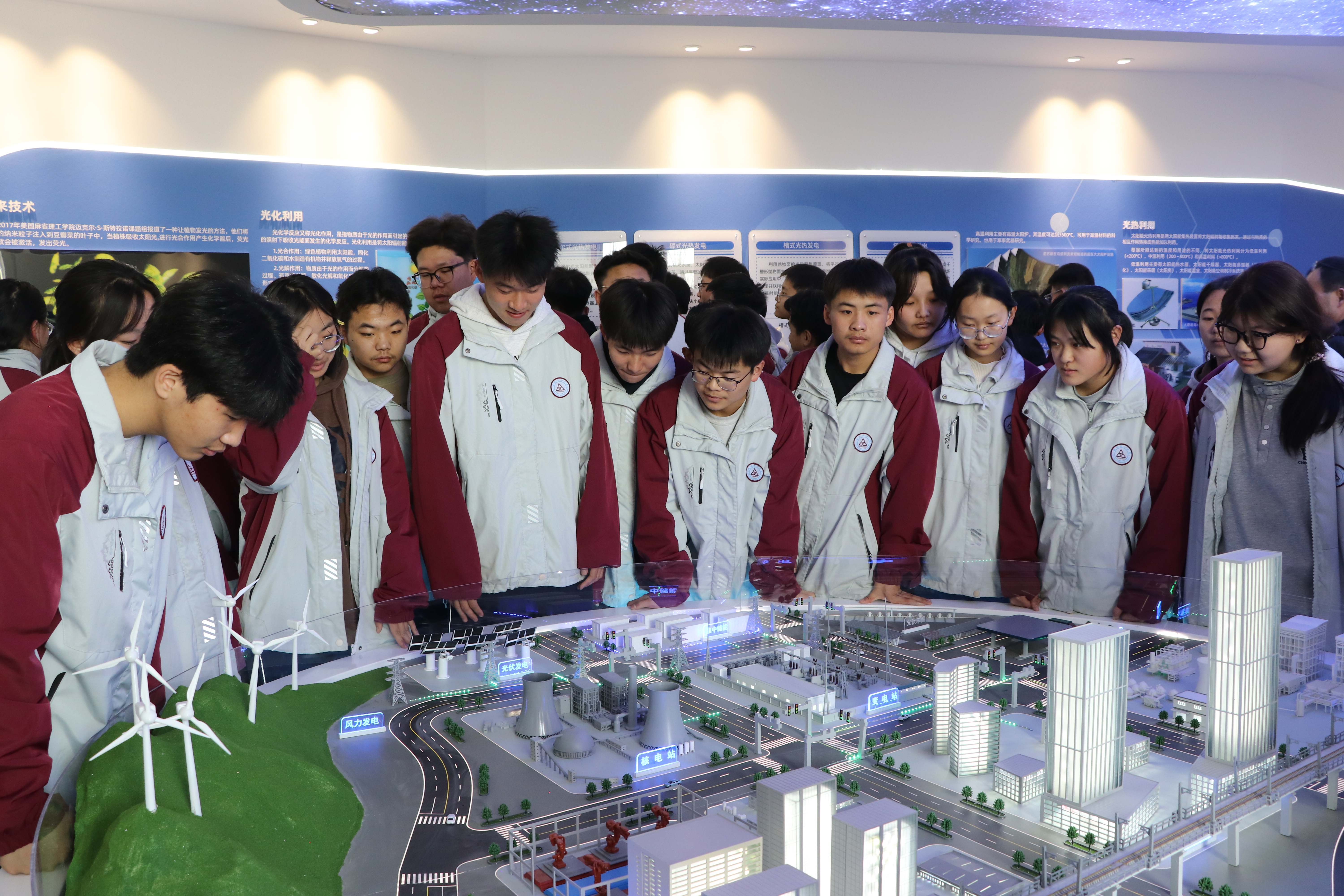 在新能源科技館講解教師講解下,學(xué)生們一邊聽(tīng)一邊體驗(yàn)觀(guān)摩。他們時(shí)而激烈討論其科學(xué)原理,時(shí)而著迷研究模型原理構(gòu)造,久久駐足觀(guān)看,流連忘返,可謂大飽眼福。