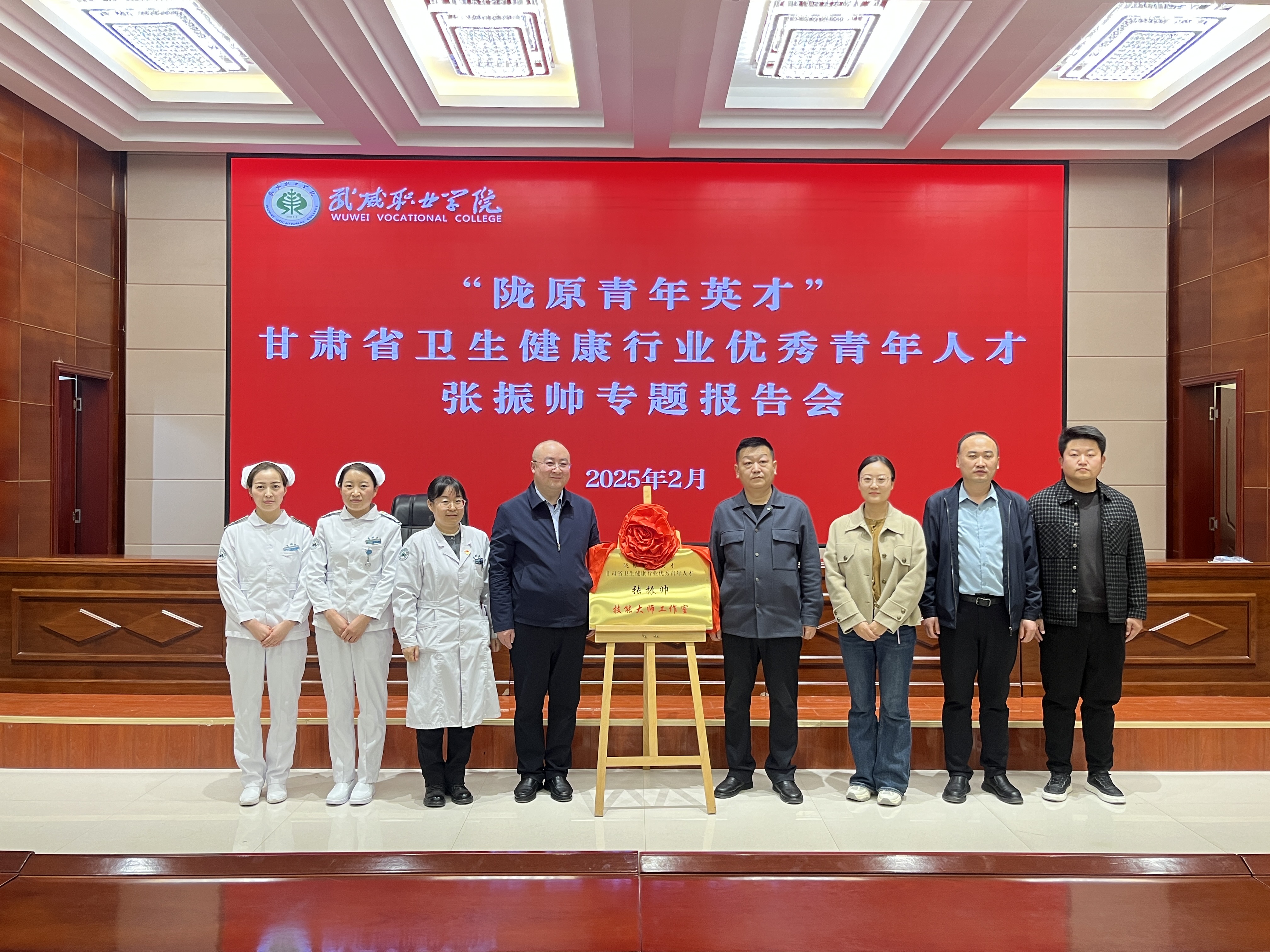2月27日,“隴原青年英才”、甘肅省衛(wèi)生健康行業(yè)優(yōu)秀青年人才張振帥技能大師工作室揭牌儀式暨專題報告會在武威職業(yè)學(xué)院菁英廳隆重舉行。藥學(xué)院副院長馬琪主持報告會,200余名師生代表參會,旨在傳承中醫(yī)藥文化,發(fā)揮技能大師引領(lǐng)作用,培育高素質(zhì)中醫(yī)藥技能人才。