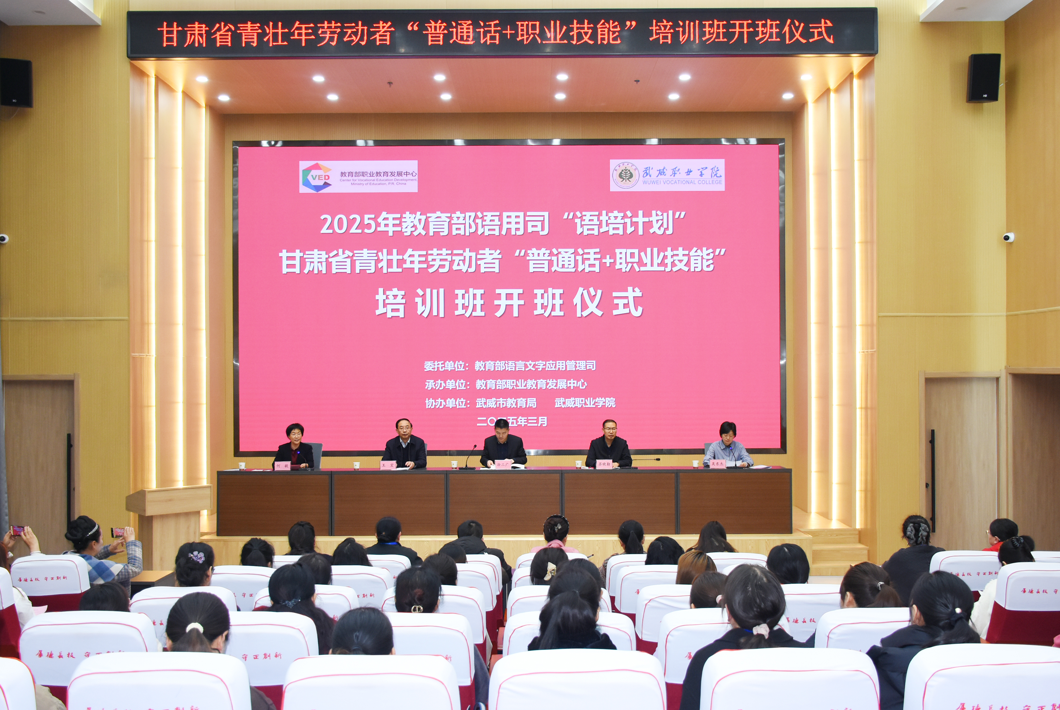 3月25日,教育部語用司“語培計(jì)劃”甘肅省青壯年勞動(dòng)者“普通話+職業(yè)技能”培訓(xùn)班在學(xué)校成功開班。本次培訓(xùn)由教育部語用司主辦,教育部職業(yè)教育發(fā)展中心承辦,武威市教育局和學(xué)校協(xié)辦。本次培訓(xùn)是深入貫徹落實(shí)黨的二十大和二十屆二中、三中全會精神,落實(shí)全國教育大會精神,實(shí)施《教育強(qiáng)國建設(shè)規(guī)劃綱要(2024-2035年)》的重要舉措,旨在進(jìn)一步推廣國家通用語言文字的應(yīng)用,促進(jìn)鑄牢中華民族共同體意識。